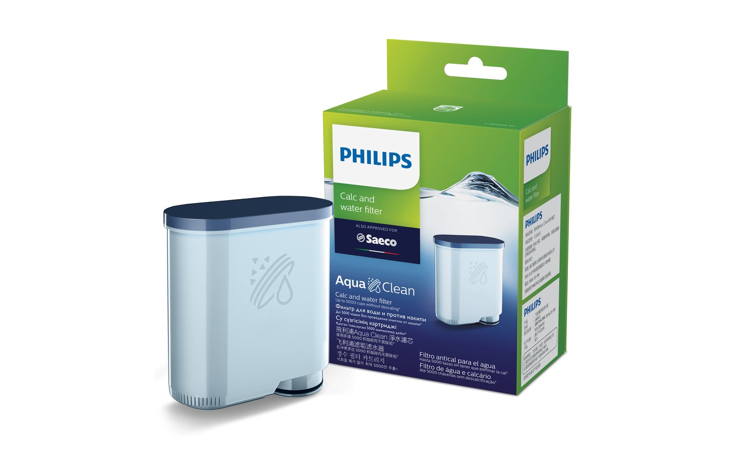 El innovador filtro de agua AquaClean reduce la formación de cal. Puedes disfrutar del café recién hecho con agua pura. Utiliza únicamente el filtro de agua AquaClean de Philips para garantizar la máxima vida útil y seguridad de tus aparatos Philips y Saeco.