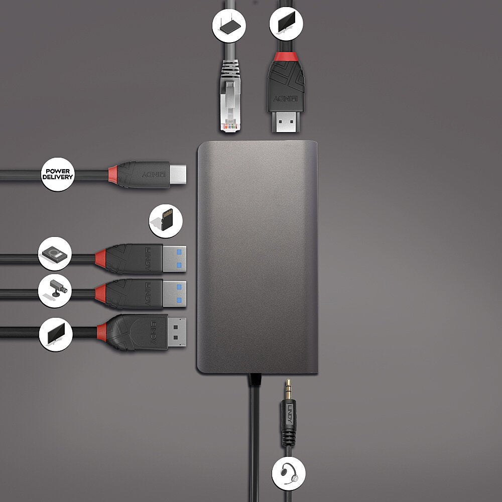 Lindy 43323. Tecnología de conectividad: Alámbrico, Interfaz de host: USB 3.2 Gen 1 (3.1 Gen 1) Type-C, Entrega de energía USB (USB Power Delivery) de hasta: 100 W. Ethernet LAN, velocidad de transferencia de datos: 1000 Mbit/s. Color del producto: Negro, Gris, Tarjetas de memoria compatibles: SD, Velocidad de transferencia de datos: 5 Gbit/s. Alimentación: USB. Ancho: 116,5 mm, Profundidad: 61 mm, Altura: 16 mm