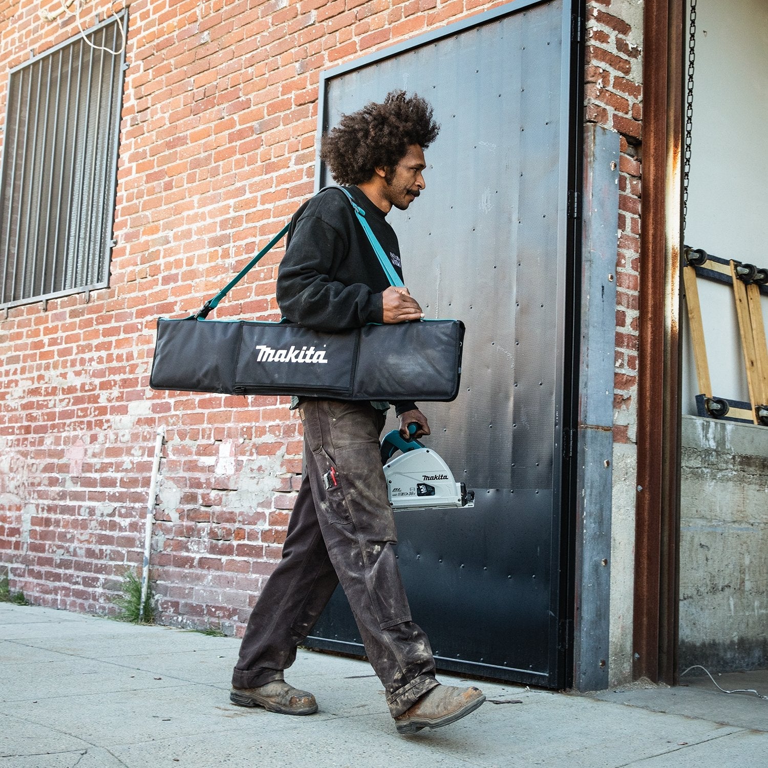 Muchos contratistas están considerando sierras circulares en descenso con sistemas de riel como una opción portátil a las sierras de mesa para simplificar productos de hoja y otras aplicaciones de corte. Para fácil transporte y almacenamiento de rieles guía de 39" de Makita (se venden por separado), la Bolsa de Protección para Riel Guía es el accesorio ideal.
