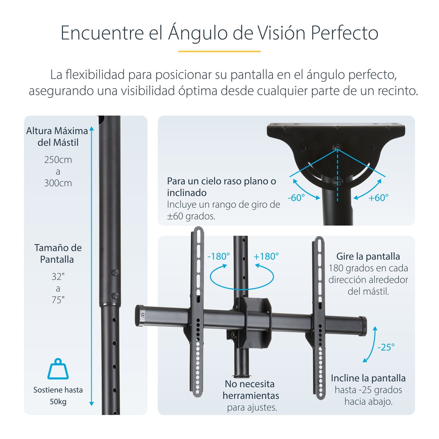 StarTech.com Soporte de Techo para TV - Soporte Universal de Cielo Raso para TV con Mástil Telescópico Largo Ajustable - Soporte VESA para Pantallas de 32" a 75" - Giro e Inclinación. Capacidad máxima de peso: 50 kg, Tamaño mínimo de pantalla: 81,3 cm (32"), Tamaño máximo de pantalla: 190,5 cm (75"), Compatibilidad con interfaz de montaje (min): 200 x 200 mm, Compatibilidad con interfaz de montaje (max): 600 x 400 mm. Rango de ajustes de altura: 2500 - 3000 mm, Ángulo de inclinación: -25 - 0°. Color del producto: Negro