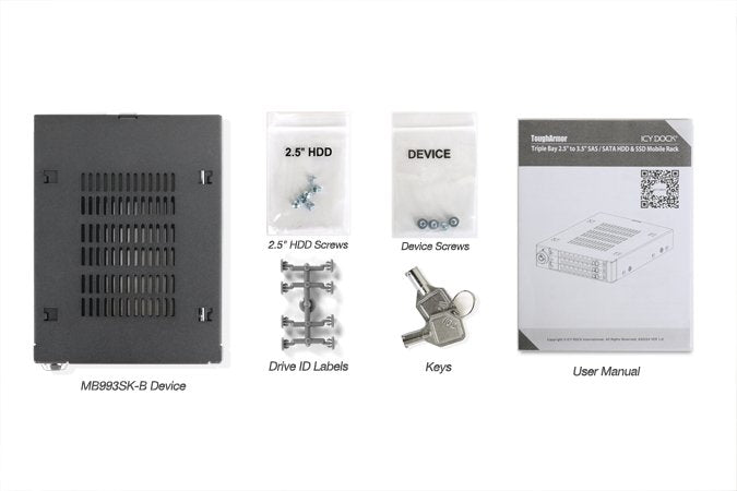 Icy Dock MB993SK-B. Tamaño (imperial): 2,5/3,5", Tipo: Panel de instalación, Color del producto: Negro. Ancho: 101,2 mm, Profundidad: 133 mm, Altura: 25,4 mm. Peso del paquete: 440 g. Número de llaves para el candado incluidas: 2 pieza(s)