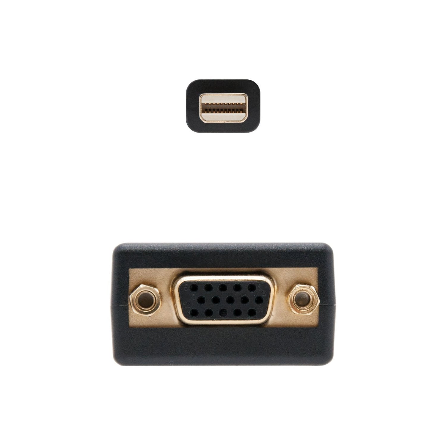 - Conversor mini DP a SVGA con conector mini DP (20 Pines) macho en un extremo y SVGA hdb15 hembra en el otro.
