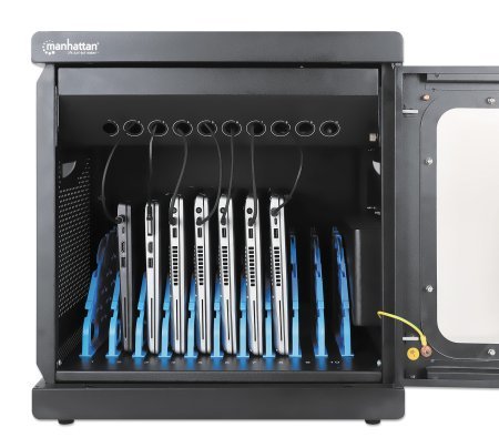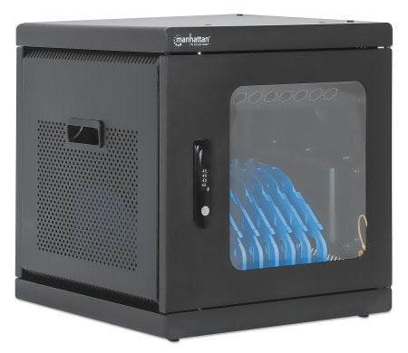 Manhattan 180924. Tipo: Armario de gestión y carga para dispositivos portátiles, Color del producto: Negro, Ubicación: Pared. Dispositivos portátiles compatibles: Portátil, Tamaño máximo de pantalla: 39,6 cm (15.6"), Fuente de carga: Corriente alterna. Voltaje de entrada AC: 100 - 250 V, Frecuencia de entrada AC: 50 - 60 Hz, Corriente de entrada: 16 A. Certificación: CE RoHS REACH IEC 60320 IEC 60884. Ancho: 460 mm, Profundidad: 477 mm, Altura: 485 mm