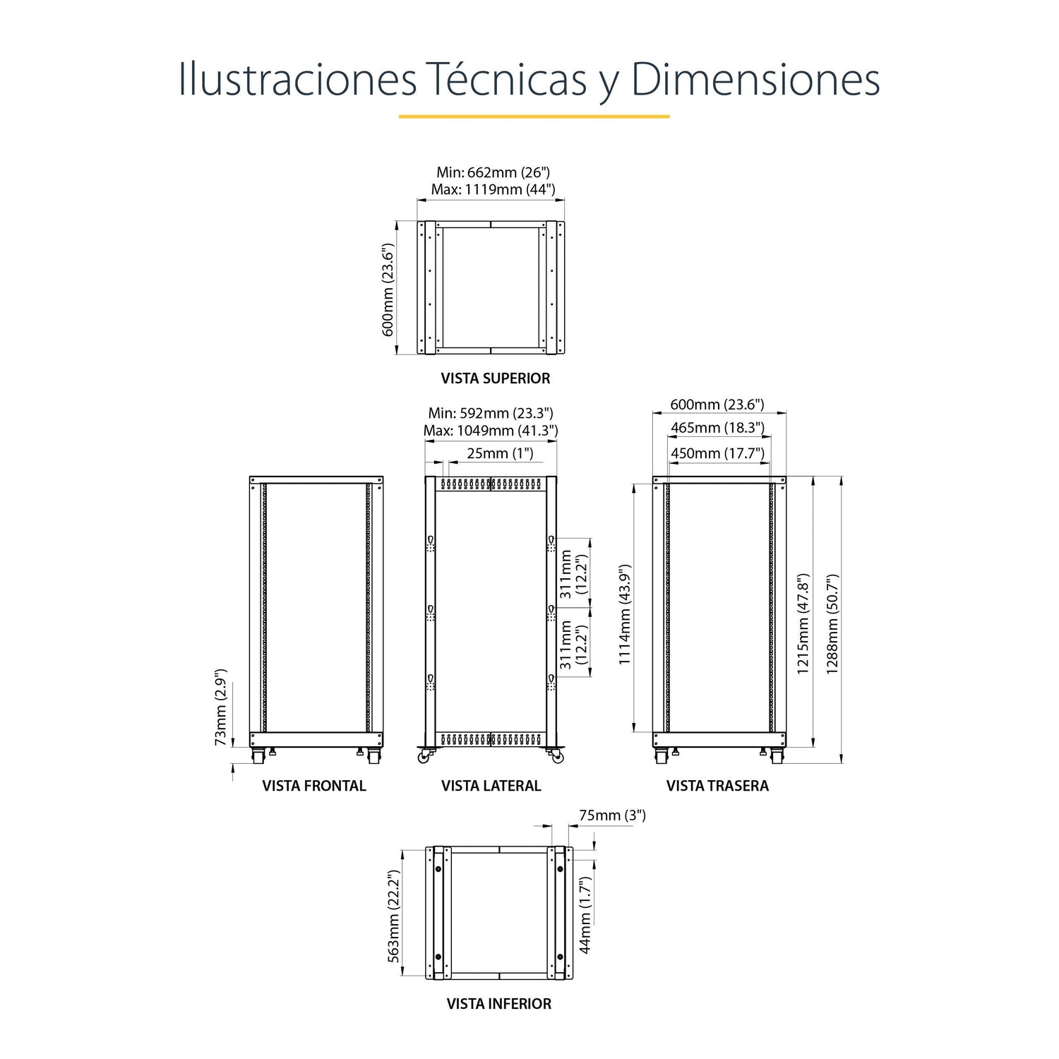 Con un diseño orientado a la sencillez de uso, este rack 25U incluye marcas que indican tanto el fondo, como las unidades (U) del rack, con un amplio rango de ajustes (22 a 40 pulgadas)/(56,0 a 101,7cm) que facilitan la adaptación del rack al equipo.