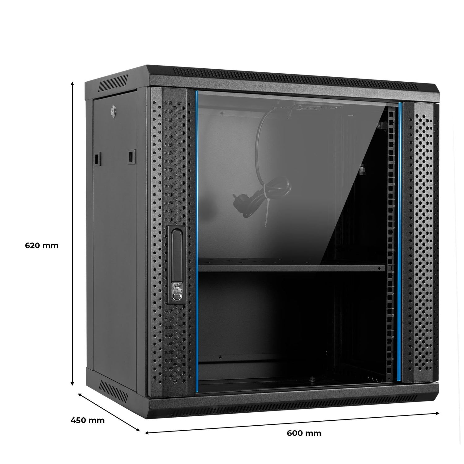 - Armario rack mural con ancho estándar de 19” (482,6 mm), con amplio espacio interior para componentes y cableado. Diseño compacto y resistente.