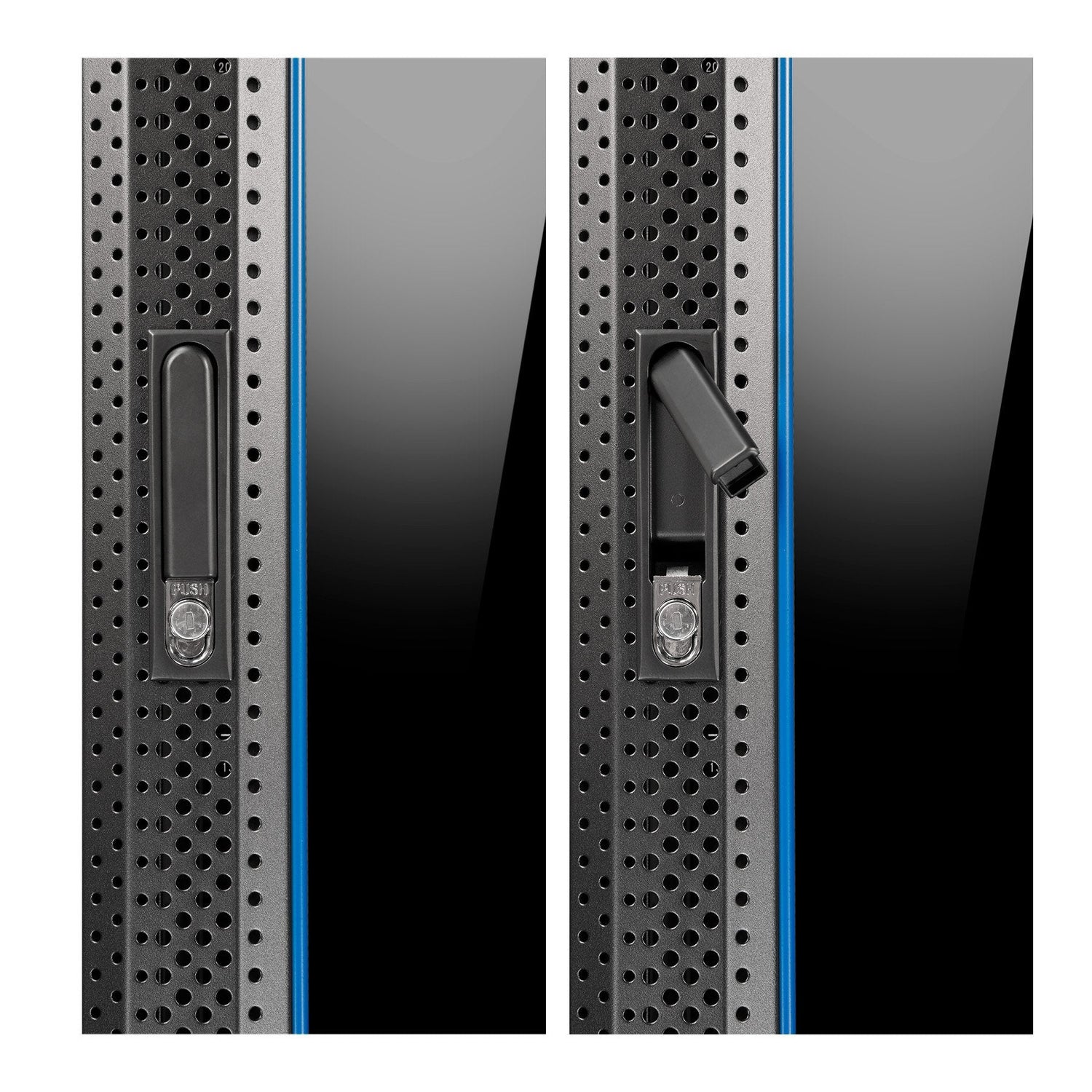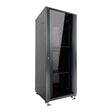 Distintas alturas y capacidades que van desde 22U a 47U, con anchos de entre 600 mm a 800 mm y fondos entre 600 mm a 1000 mm. Todos los armarios poseen puertas de cristal, perforadas o, en el caso de los armarios más grandes, existe la opción de doble puerta, lo que permite trabajar en una parte del mueble mientras la otra parte está cerrada y protegida.