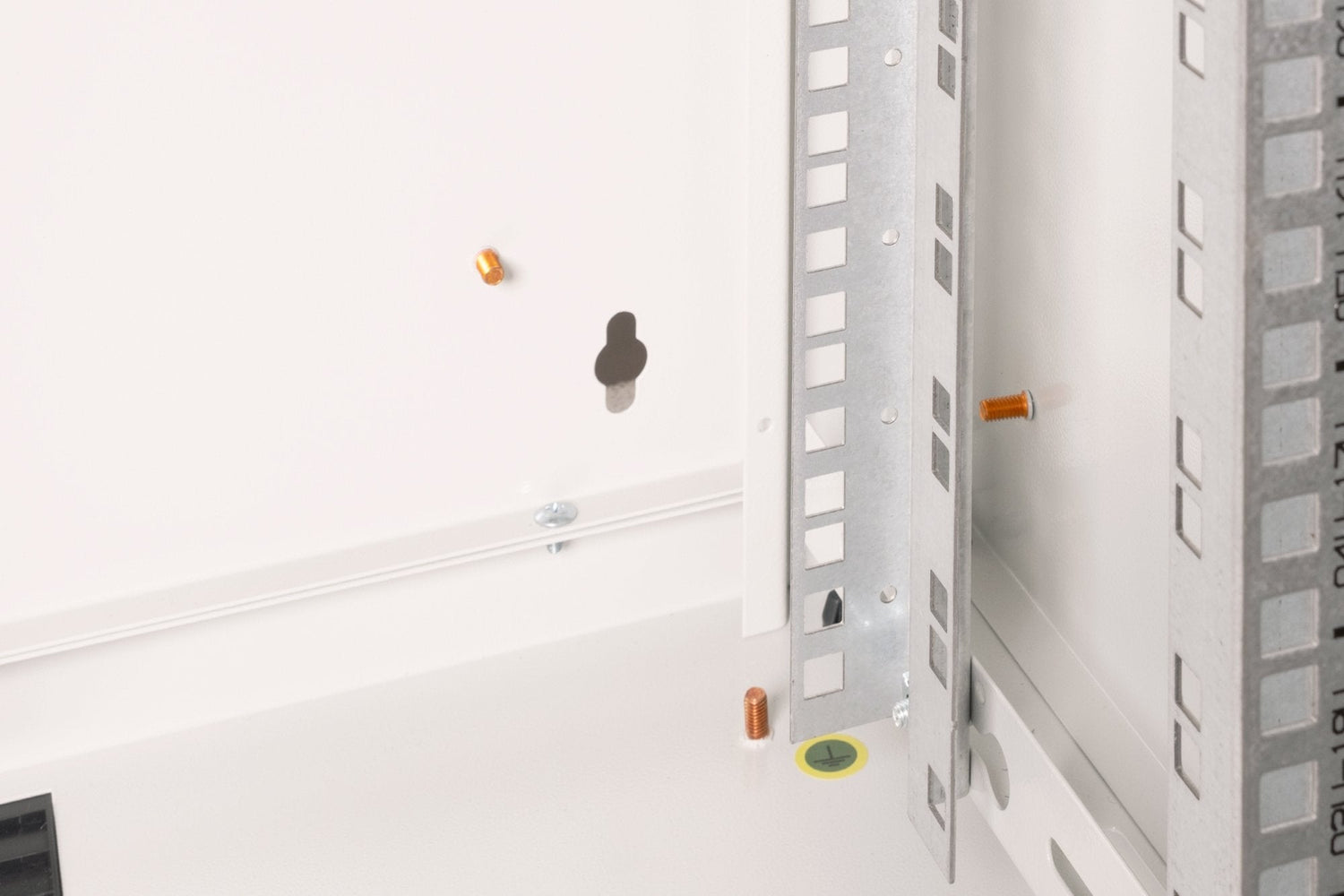- Carriles de perfil de 483 mm (19'') instalados en la parte delantera y trasera del armario, galvanizados