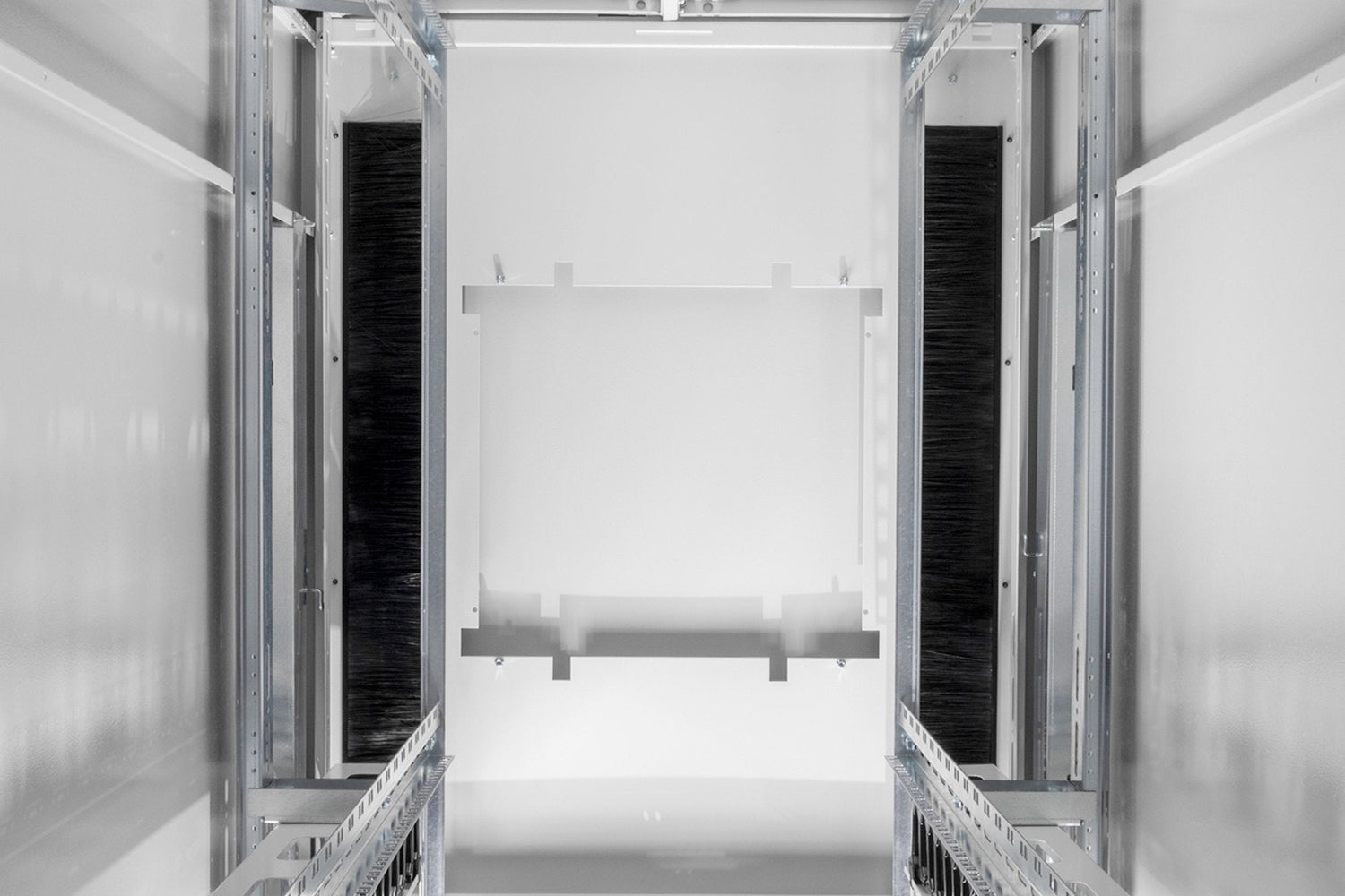 - Las guías de perfil de 483 mm (19”) están conectadas con el bastidor principal a través de elementos de profundidad en 4 puntos a la izquierda y la derecha