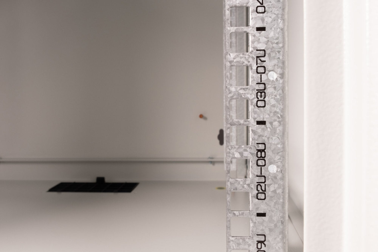 Los armarios de red para el montaje en la pared de la serie Unique han sido desarrollados para el cableado especialmente cómodo y flexible de redes. En el techo de cada armario se encuentra una entrada de cable deslizante con junta de caucho. El panel posterior y la chapa base están dotados de entradas para cables troqueladas con cubierta de plástico. Para el alojamiento de un módulo ventilador se incluye además una zona troquelada en el chasis de techo. En el interior está instalado dos pares de guías de perfil de 483 mm (19") galvanizadas y rotuladas con unidades de altura legibles desde ambos lados. Estas se pueden ajustar en profundidad. Cada armario es una robusta construcción de acero, hecha de chapa de acero con un grosor de hasta 1,5 mm. El proceso de pintado se realiza en forma de un recubrimiento de polvo electrostático en los colores estándar gris (RAL 7035) y negro (RAL 9005). Las paredes laterales modulares desmontables y con cerradura y la puerta frontal desmontable y con cerradura facilitan el acceso. Es posible cambiar de lado las bisagras de las puertas. El montaje en la pared se realiza en dos pasos sencillos: El bastidor de la carcasa se atornilla en la pared y se conecta después con la carcasa. Con las patas niveladoras o ruedas disponibles como opción, las carcasas de pared de la serie Unique también se pueden utilizar de forma independiente.
