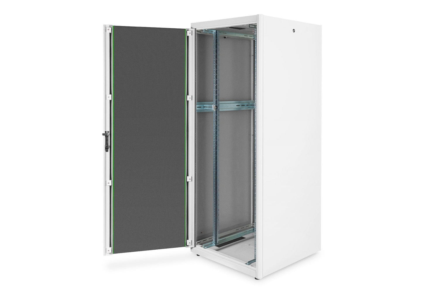 Los armarios de red de la serie Dynamic se han desarrollado para ampliar la red de forma sencilla y especialmente rentable. La sofisticada colocación de las entradas de cables garantiza una instalación sin esfuerzo en función de la aplicación. En los chasis de suelo, ésta se encuentra en el centro de la zona trasera, protegida por una placa de cubierta atornillada. Los armarios a partir de 800 mm de ancho se amplían adicionalmente con entradas de cables con tapas de plástico a izquierda y derecha. Éstas también están integradas en el techo (1 x para anchura de armario de 600 mm, 3 x para anchura de armario de 800 mm). El chasis del techo dispone además de una zona troquelada para alojar un módulo de ventilador. En el interior hay instalados dos pares de raíles perfilados galvanizados de 483 mm (19"), etiquetados con unidades de altura legibles en ambas direcciones. Pueden ajustarse en profundidad y están conectados a puntales de profundidad adicionales en el armario. Cada armario es una robusta construcción de chapa de acero de hasta 1,5 mm de grosor. La coloración se realiza mediante recubrimiento electrostático en polvo en los colores estándar gris (RAL 7035) y negro (RAL 9005). Los paneles laterales y traseros extraíbles, así como la puerta delantera con cerradura y extraíble, mejoran la accesibilidad. Las bisagras de la puerta pueden cambiarse. Además, los armarios pueden desmontarse completamente en caso necesario gracias a su diseño desmontable.