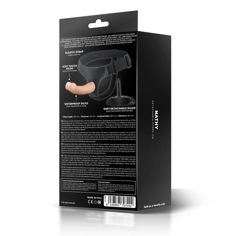 Nathy es un arnés que incluye un dildo con un tacto sedoso. Este dildo es semi realista, con el añadido de unas venas marcadas para añadir placer, y cuenta con un tacto sedoso e increíble al tacto.