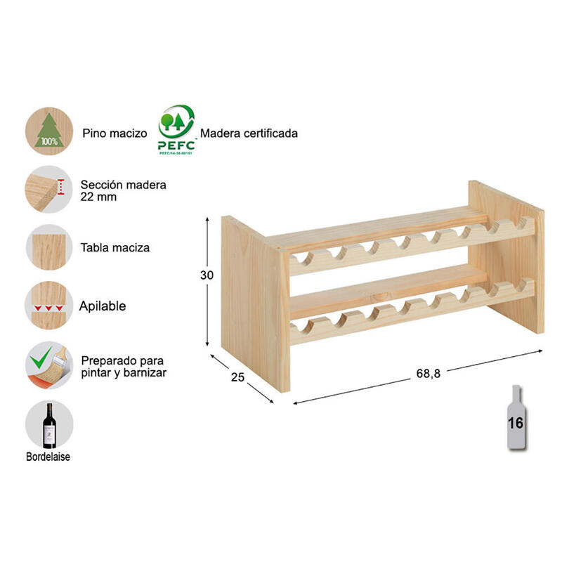 Botellero Pino Macizo Merlot 16 Botellas 68,8x25x30cm Astigarraga