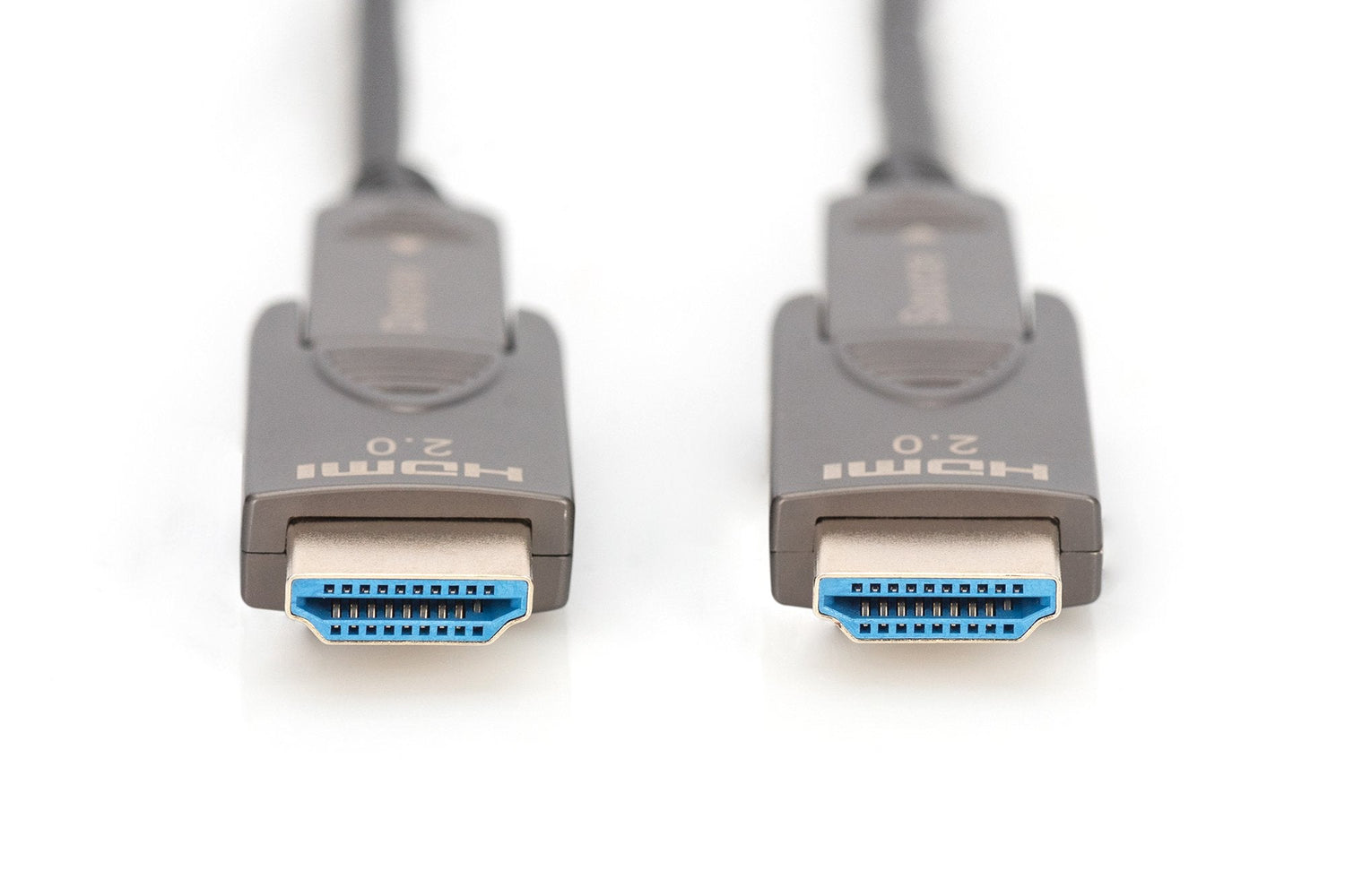 Digitus Cable de fibra óptica híbrido 4K HDMI AOC con 30m conector desmontable. Longitud de cable: 30 m, Conector 1: HDMI tipo A (Estándar), Género del conector 1: Macho, Conector 2: HDMI tipo A (Estándar), Género del conector 2: Macho, Contactos del conector chapado: Oro, Versión HDMI: 2.0, Máxima resolución: 4096 x 2560 Pixeles, Velocidad de transferencia de datos: 18 Gbit/s, Canal de retorno de audio (ARC), Color del producto: Negro
