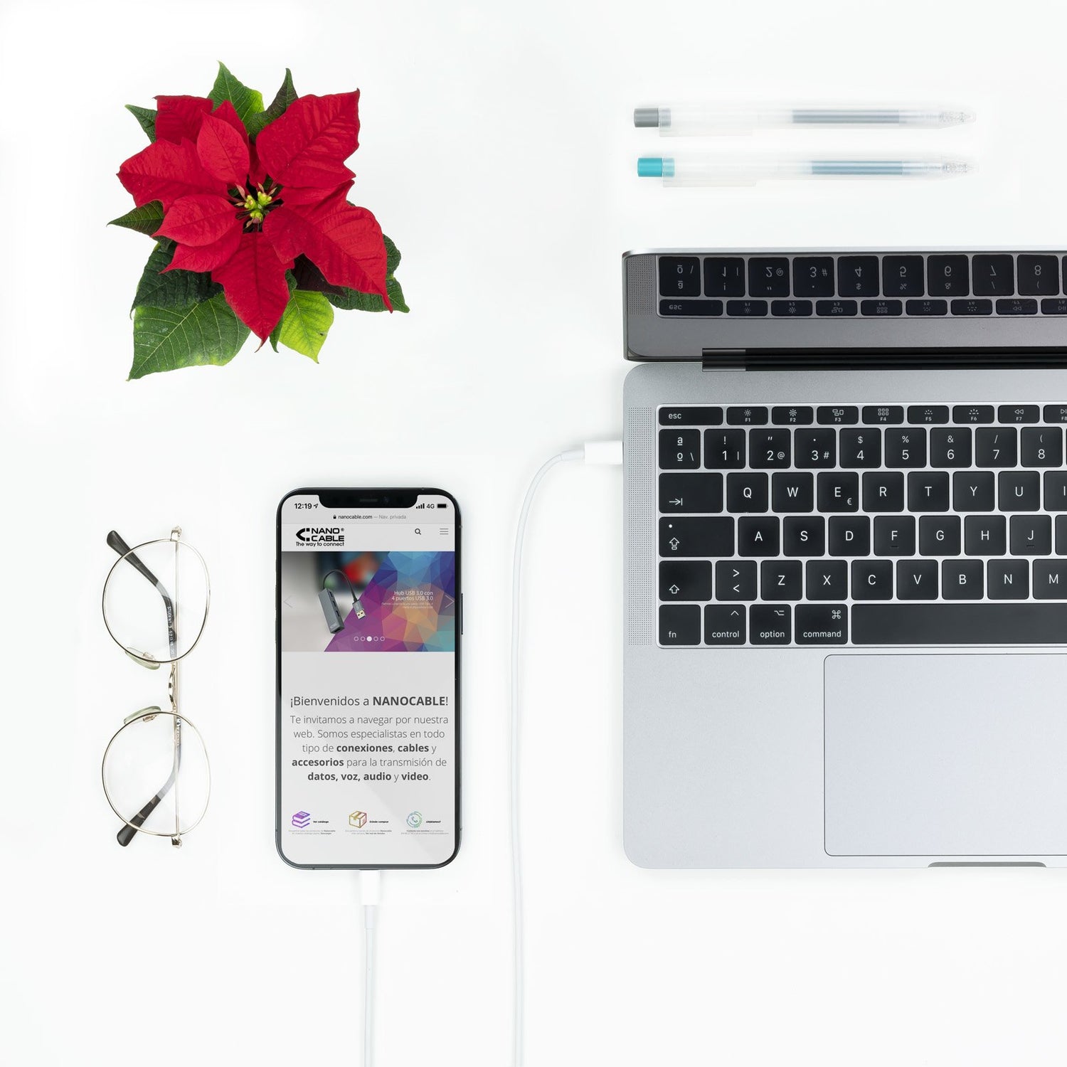 - Cable Lightning con conector tipo Lightning macho en un extremo y conector USB-C macho en el otro
