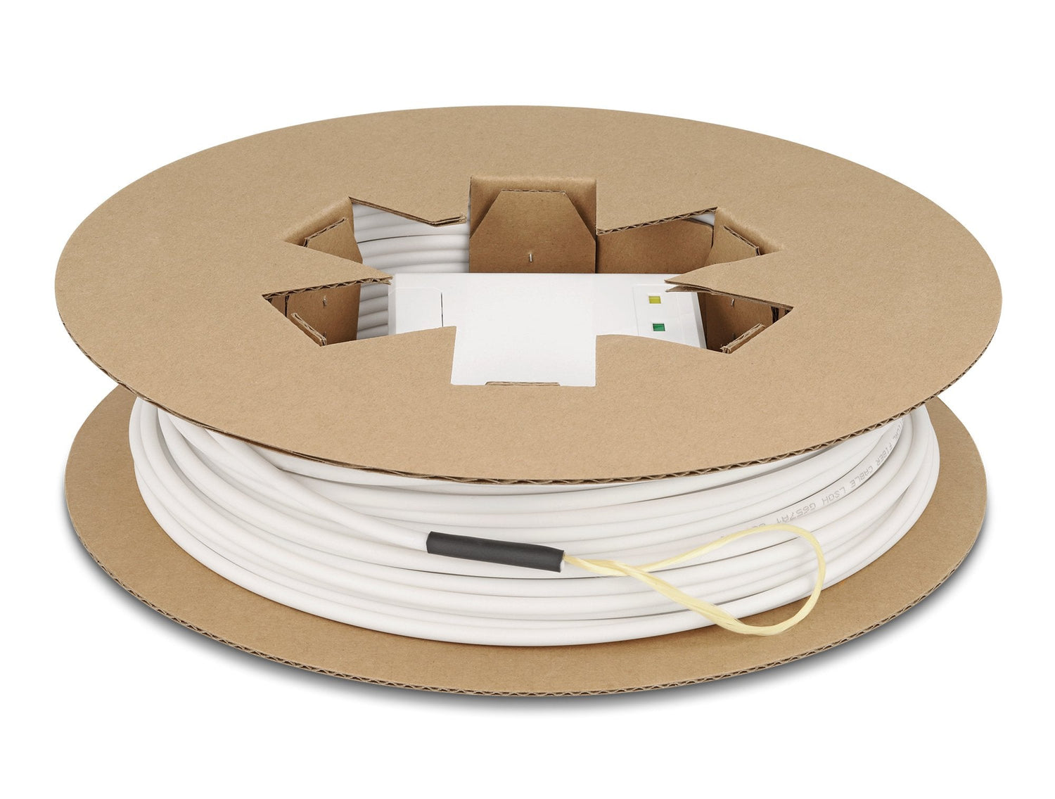 El cable de acometida está en una bobina en una caja de cartón y los cables ya están montados en la caja de conexiones. La caja de cartón cerrada permite sacar los cables fácilmente y colocarlos hasta el distribuidor de la casa.