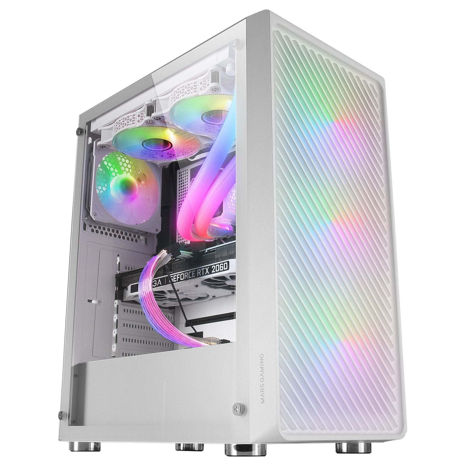Mars Gaming MC-F, Semitorre Gaming ATX, Ventana Completa Cristal Templado, Frontal Metal-Mesh, 4X Ventiladores ARGB 120mm, Blanco. Factor de forma: Midi Tower, Tipo: PC, Color del producto: Blanco. Factores de forma de la fuente de alimentación compatibles: ATX. Diámetro de ventiladores frontales soportados: 120,140 mm, Diámetro de ventiladores traseros soportados: 120 mm, Diámetros de ventiladores superiores soportados: 140,120 mm. Tamaños de disco duro soportados: 3.5", Factor de forma de disco SSD: 2.5". Ancho: 216 mm, Profundidad: 335 mm, Altura: 445 mm