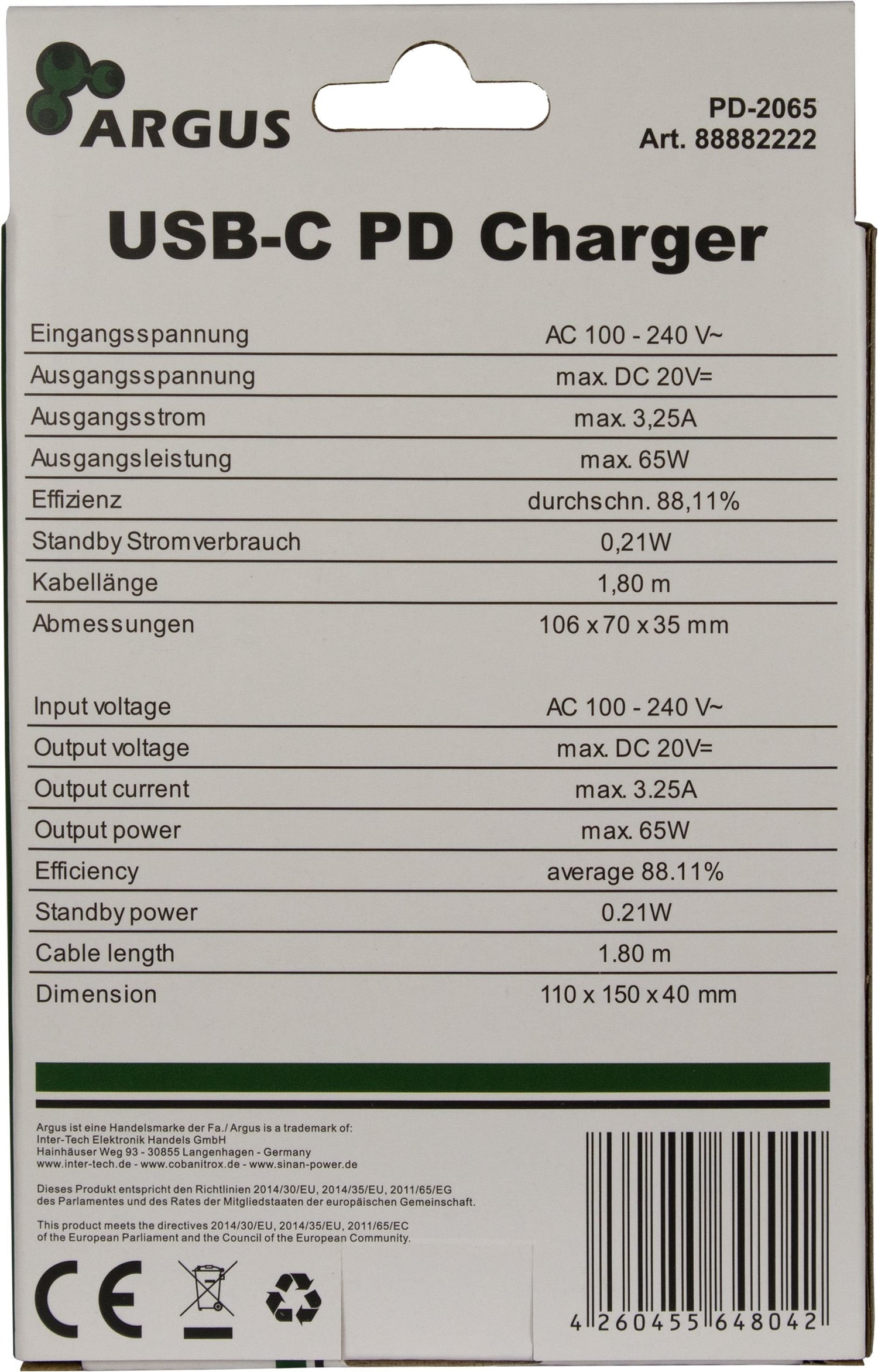 Inter-Tech PD-2065. Tipo de cargador: Interior, Alimentación: Corriente alterna, Compatibilidad del cargador: Universal. Voltaje de salida máximo: 20 V. Número de puertos USB Tipo C: 1. Color del producto: Negro