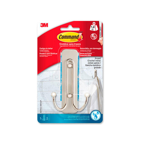 Gancho Doble, Grande, Níquel Satinado, 1 Ud + 2 Tiras,Carga Max 1,8 Kg