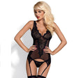Elegante y sensual corset con liguero. Cuenta con detalles florales con el cuello y la cadera con bonitos detalles. Los tirantes son ajustables e incluye el tanga a juego.