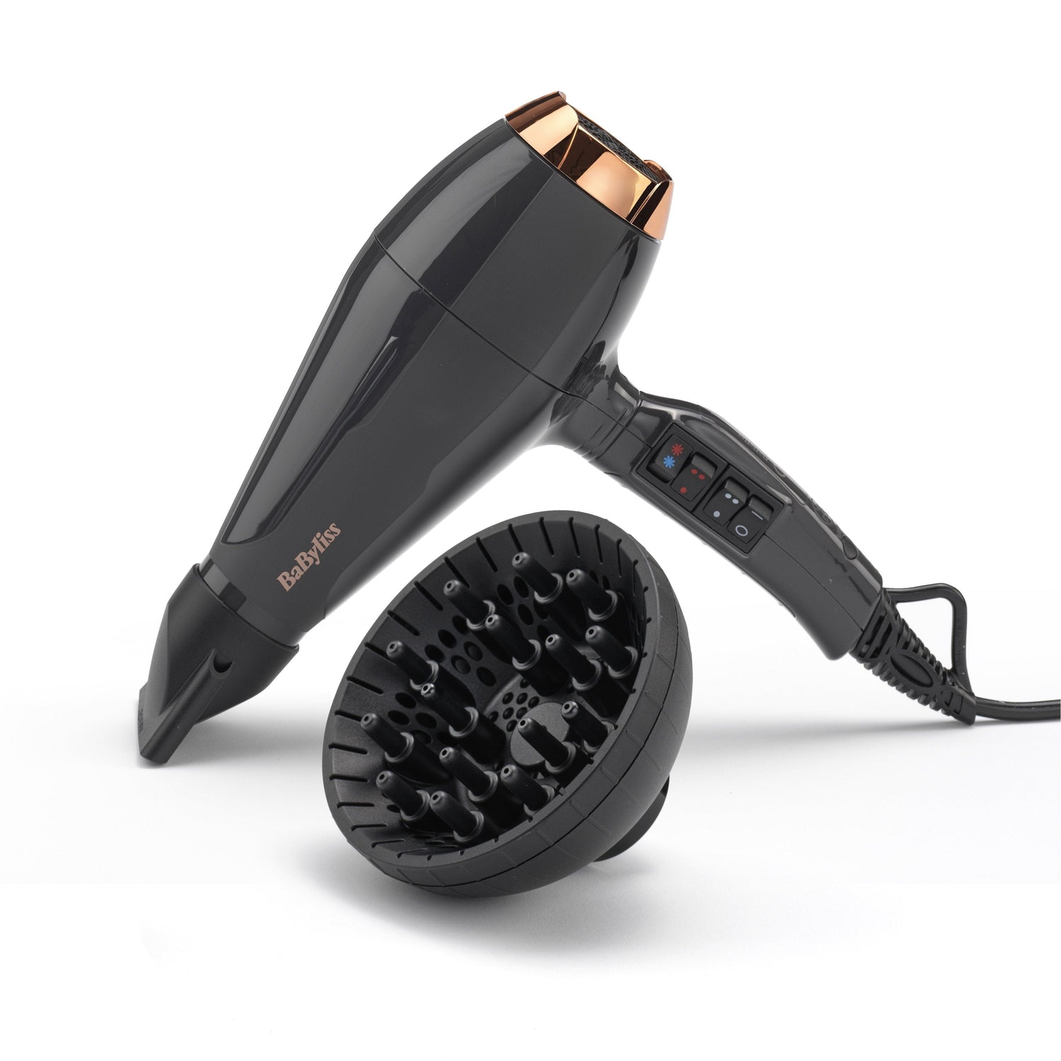BaByliss 6719DE. Tipo de motor: Corriente alterna, Velocidad del aire: 32 m/s. Color del producto: Negro, Coloración de superficie: Monocromo, Tipo de colgador: Con agujero en la empuñadura para colgar. Potencia: 2200 W, Frecuencia de entrada AC: 50/60 Hz. No contiene: PFAS, Periodo de garantía: 5 año(s). Ancho: 260 mm, Profundidad: 90 mm, Altura: 278 mm