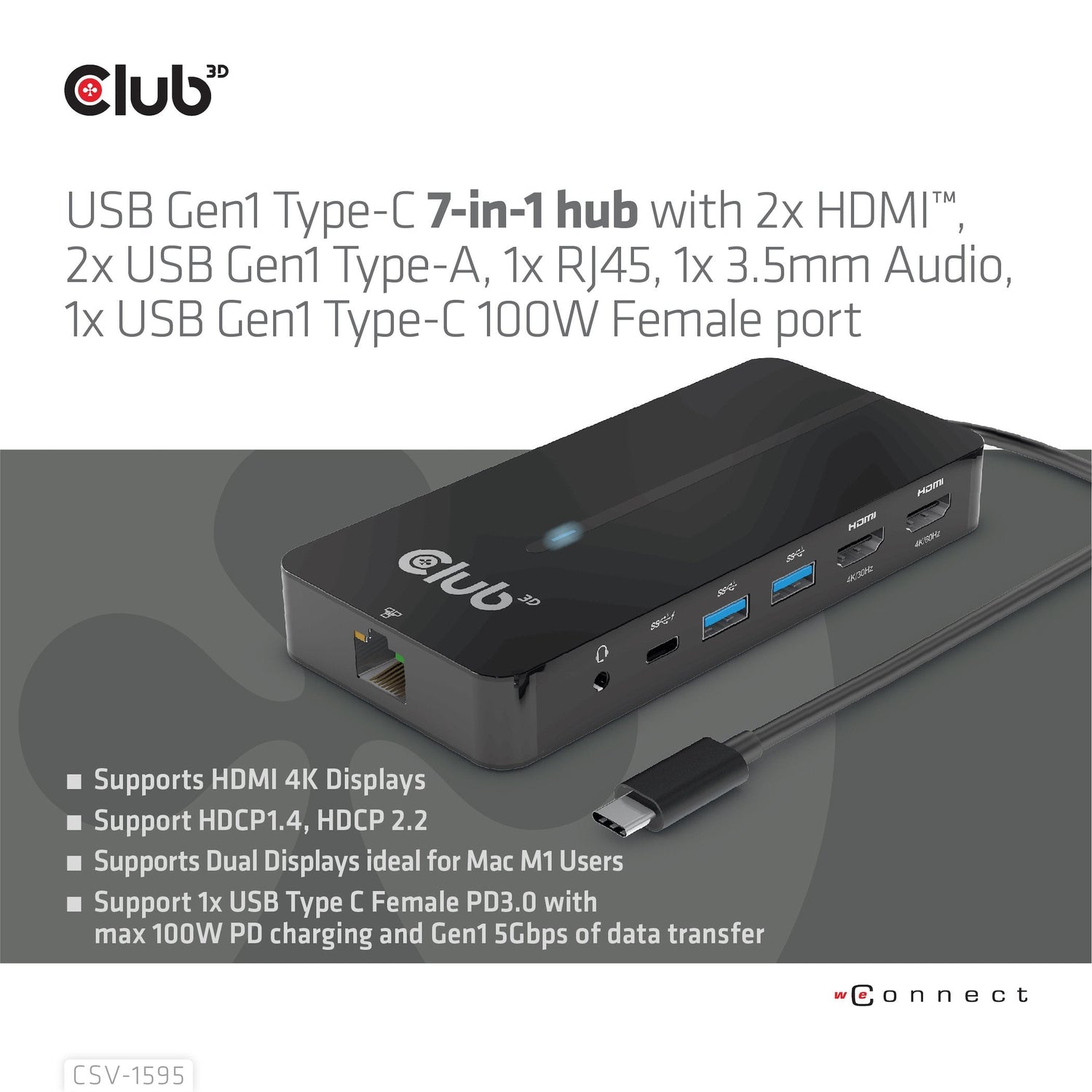 CLUB3D CSV-1595. Interfaz de host: USB 3.2 Gen 1 (3.1 Gen 1) Type-C, Entrega de energía USB (USB Power Delivery) de hasta: 100 W. Ethernet LAN, velocidad de transferencia de datos: 10,100,1000 Mbit/s. Color del producto: Negro, Tipo HD: 4K Ultra HD, Máxima velocidad de actualización: 60 Hz. Voltaje de salida: 5 V, Corriente de salida: 1,5 A, Consumo de energía (max): 7,5 W. Ancho: 140 mm, Profundidad: 65 mm, Altura: 19 mm