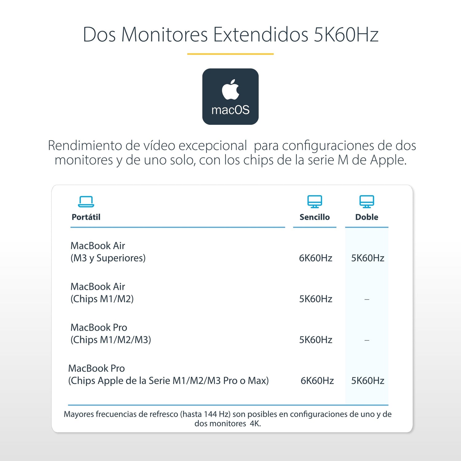 Los ordenadores Apple equipados con procesadores M1, M2 o M3 Max/Pro admiten pantallas dobles. Los ordenadores Apple equipados con el procesador base M1, M2 o M3 admiten una sola pantalla.
