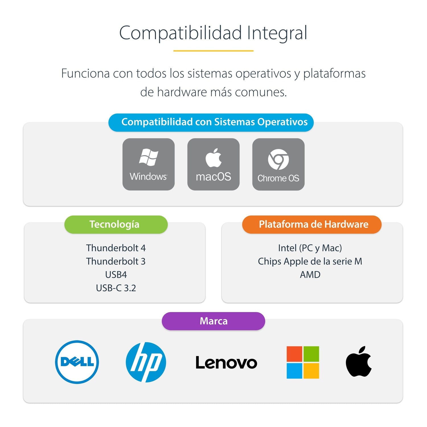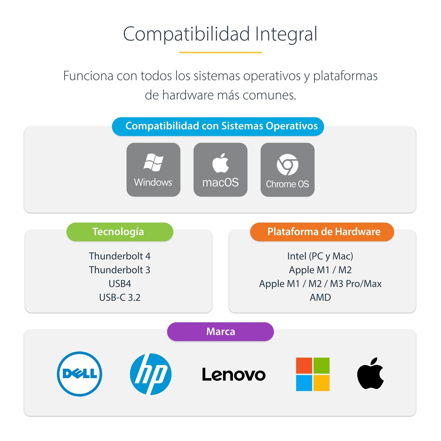 Esta certificación garantiza que la base será totalmente compatible con los portátiles Intel Evo/Tiger Lake (11th gen & up) Thunderbolt 4, incluyendo: Dell Precision 5560/5760, XPS 13 9310, HP EliteBook 850 G8, ProBook 450 G8 y Lenovo X1 Carbon 9th Gen. La base también es compatible con los MacBooks M1/M2/M3 Pro/Max.