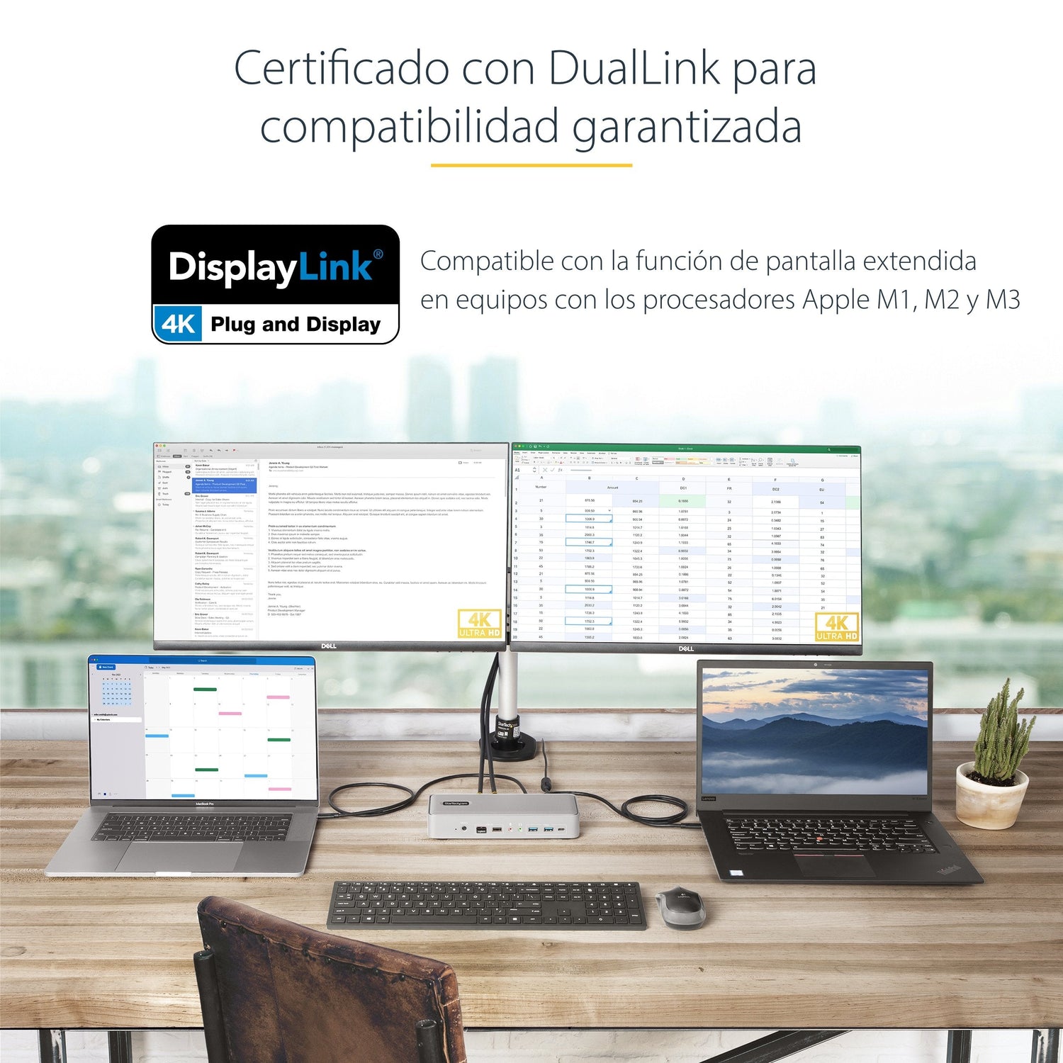 El Dock cuenta con la certificación DisplayLink, para compatibilidad Plug and Display con Windows, ChromeOS y macOS, lo que permite el funcionamiento y el cambio entre varios ordenadores con sistemas operativos diferentes. La tecnología DisplayLink también es compatible con dos pantallas ampliadas en los MacBook M1/M2 de Apple que no son capaces de manejar de forma nativa más de una pantalla externa. La certificación DisplayLink garantiza la compatibilidad con resoluciones de hasta 4K 60Hz en ambas pantallas externas.