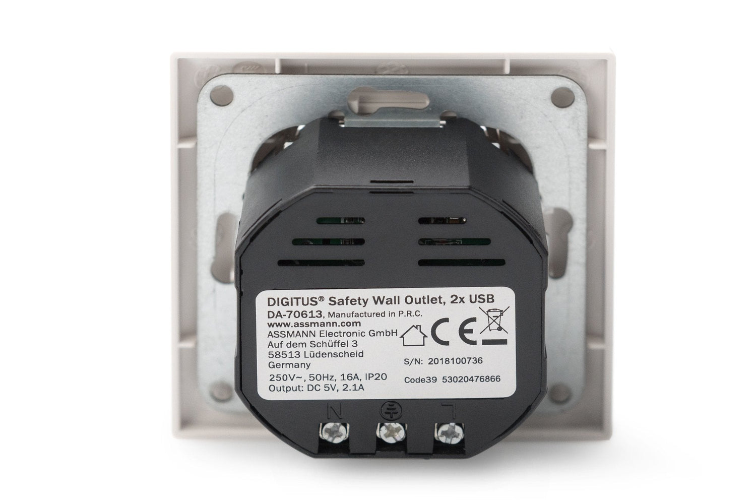 Digitus Enchufe con dos puertos USB. Tipo de enchufe: 2x USB. Color del producto: Blanco. tensión nominal: 250 V, frecuencia nominal: 50 Hz, Voltaje de salida USB: 5 V. Ancho: 85 mm, Profundidad: 85 mm, Profundidad de pieza visible: 3,8 cm. Ancho del paquete: 60 mm, Profundidad del paquete: 90 mm, Peso del paquete: 156 g