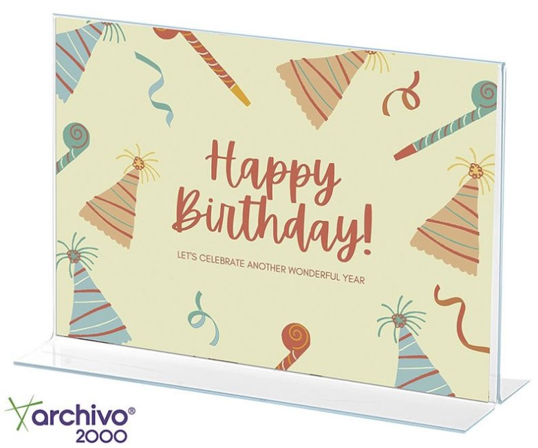 Expositor sobremesa en forma de T Archivo 2000 A5 horizontal. Fabricado en poliestireno ultra transparente de gran calidad y resistencia. Visibilidad por ambas caras. El documento se introduce por la parte inferior o por cualquiera de los laterales. Amplia base que lo hace muy estable