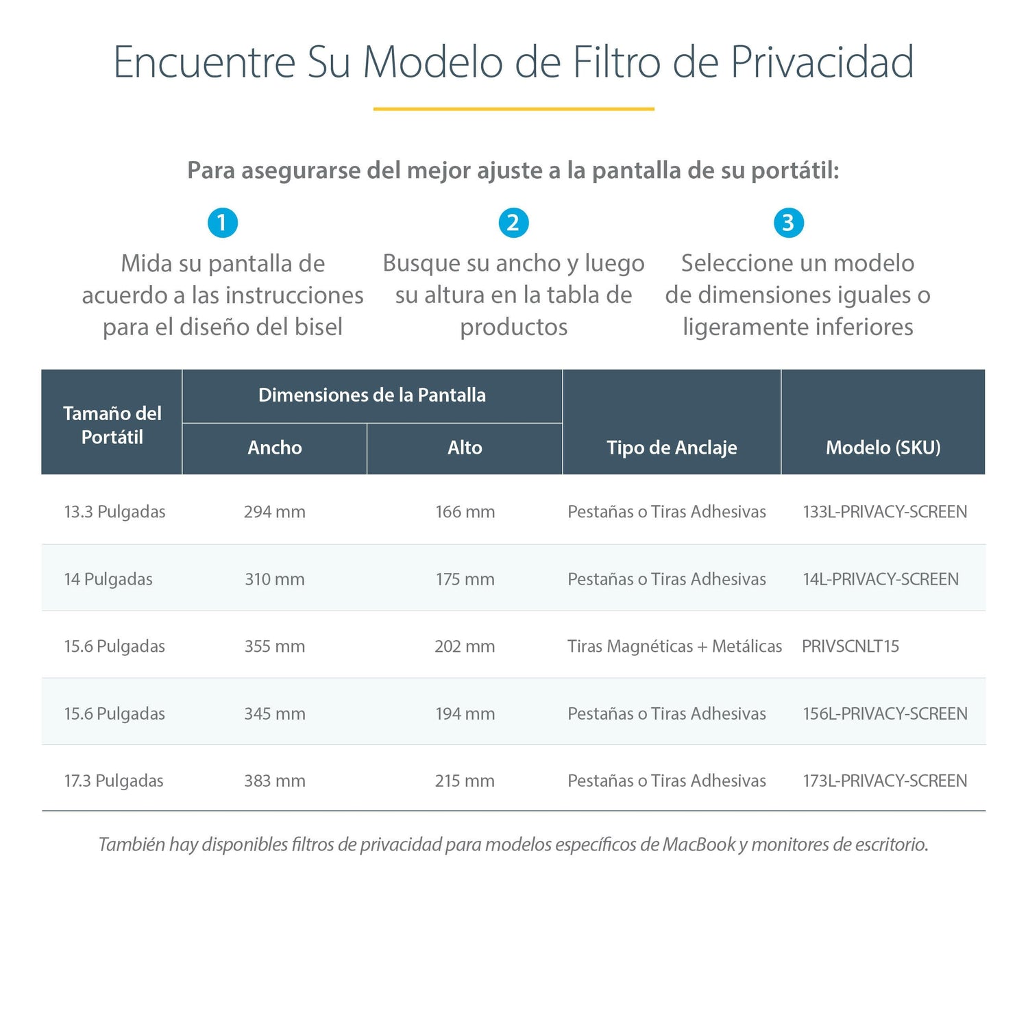 - Filtros de privacidad de pantalla: Antideslumbrante, Privacidad