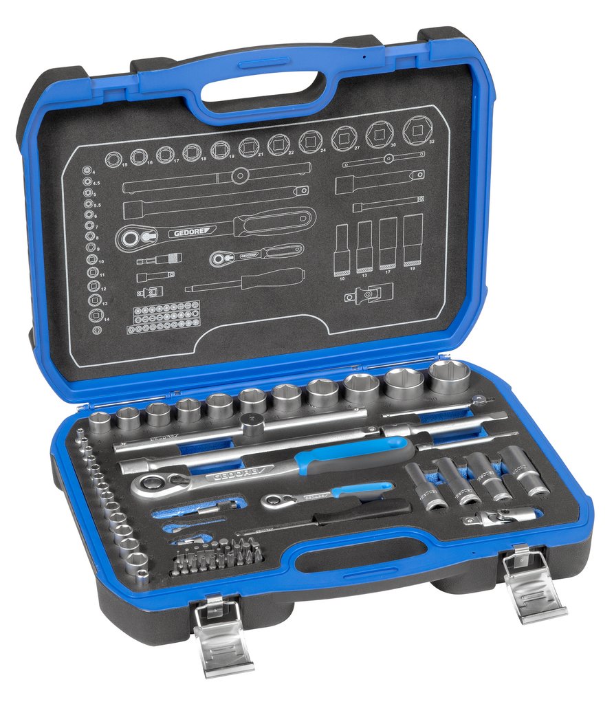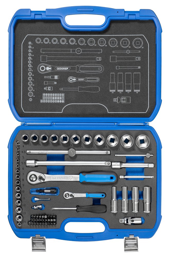 Gedore Juego De Llaves De Vaso 19 Bmc 20, 1/4" + 1/2", Juego De Herramientas Negro/Azul, 69 Piezas, Con 2 Carracas Reversibles
