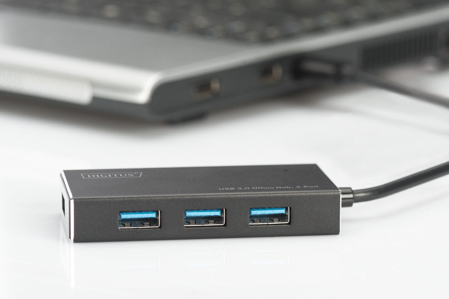 Digitus Concentrador para oficina USB 3.0, 4 puertos. Interfaz de host: USB 3.2 Gen 1 (3.1 Gen 1) Type-A, Interfaces de concentradores: USB 3.2 Gen 1 (3.1 Gen 1) Type-A. Velocidad de transferencia de datos: 5000 Mbit/s, Color del producto: Negro, Material de la carcasa: Aluminio. Ancho: 42 mm, Profundidad: 84 mm, Altura: 14 mm. Ancho del paquete: 137 mm, Profundidad del paquete: 160 mm, Volumen del paquete: 920,64 cm³