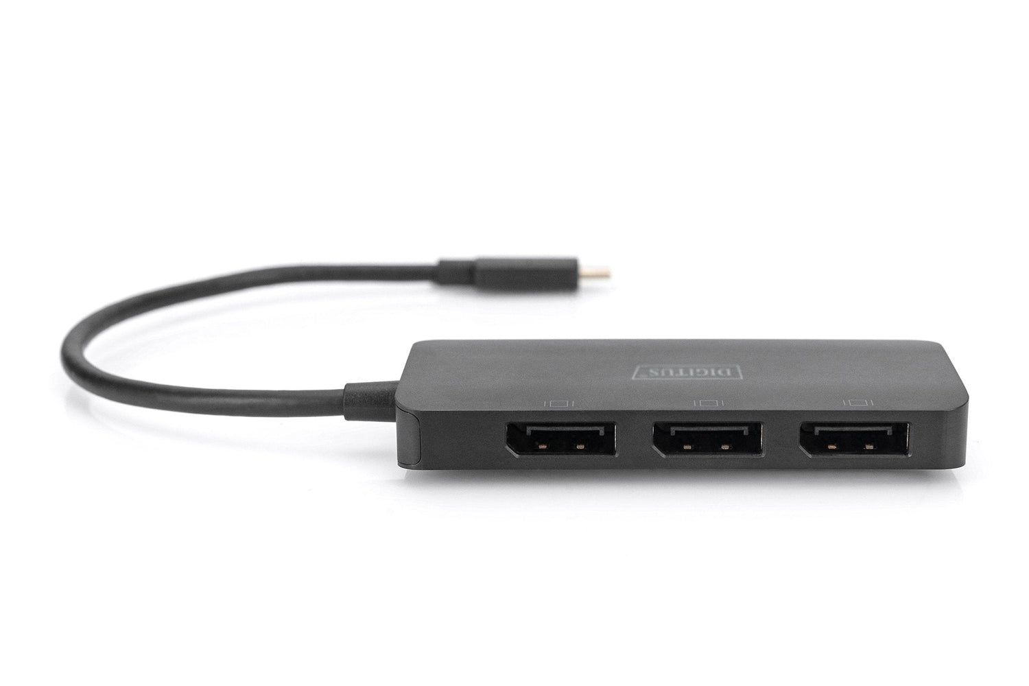 Digitus Hub de vídeo MST de 3 puertos (USB-C™ -> 3 DisplayPort). Tipo de puerto de vídeo: DisplayPort, Salida de vídeo: 3x DisplayPort. Máxima resolución: 3840 x 2160 Pixeles, Color del producto: Negro, Material de la carcasa: Acrilonitrilo butadieno estireno (ABS). Consumo de energía (inactivo): 1 W. Ancho: 36 mm, Profundidad: 252 mm, Altura: 11,5 mm. Cantidad por paquete: 1 pieza(s), Ancho del paquete: 80 mm, Profundidad del paquete: 20 mm