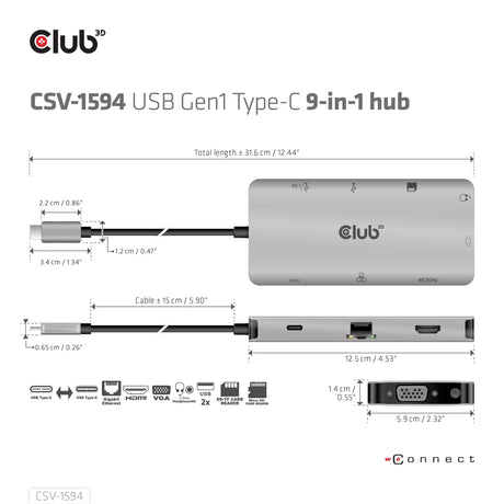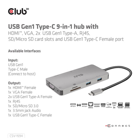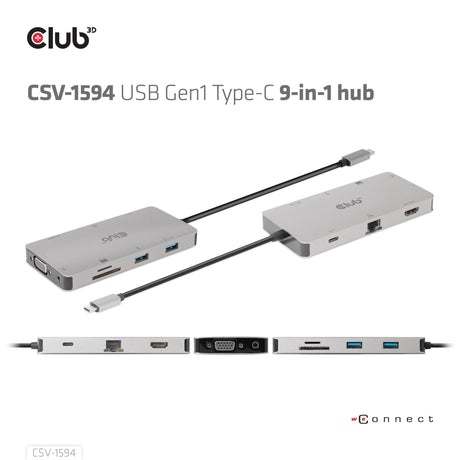 Club3d Usb-9-In1-Hub Usb-C > Hdmi/Vga/2xusb/Usb-C/Rj45/Sd Retail