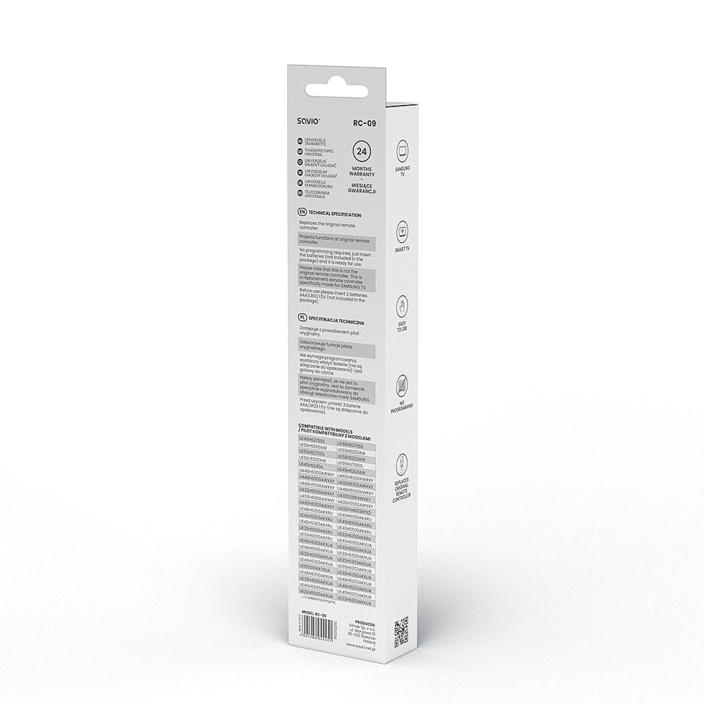 Savio RC-09 do TV Samsung - Smart TV. Marca compatible: Samsung, Uso adecuado del control remoto: TV, Interfaz: IR inalámbrico. Alcance máximo: 10 m. Tipo de entrada: Botones