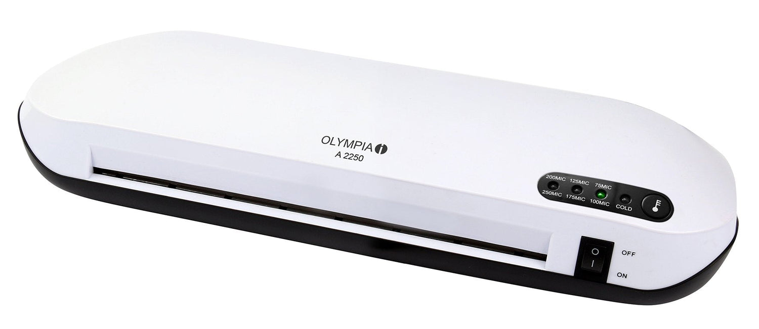 Olympia A 2250. Ancho máximo de laminación: 23 cm, Tiempo de pre calefacción: 5 min, Velocidad de laminación: 350 mm/min. Consumo energético: 350 W, Voltaje de entrada AC: 220-240 V, Frecuencia de entrada AC: 50 Hz. Ancho: 366 mm, Profundidad: 146 mm, Altura: 66 mm. Ancho del paquete: 410 mm, Profundidad del paquete: 162 mm, Altura del paquete: 82 mm