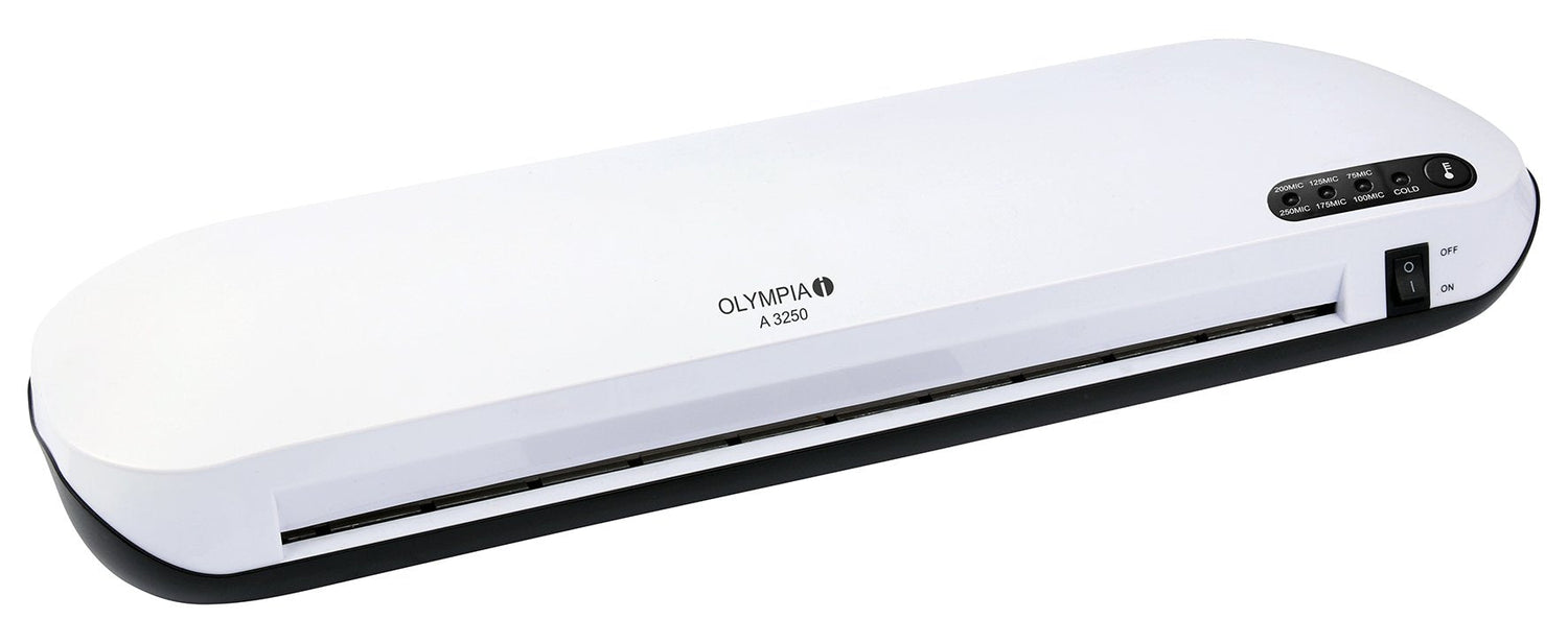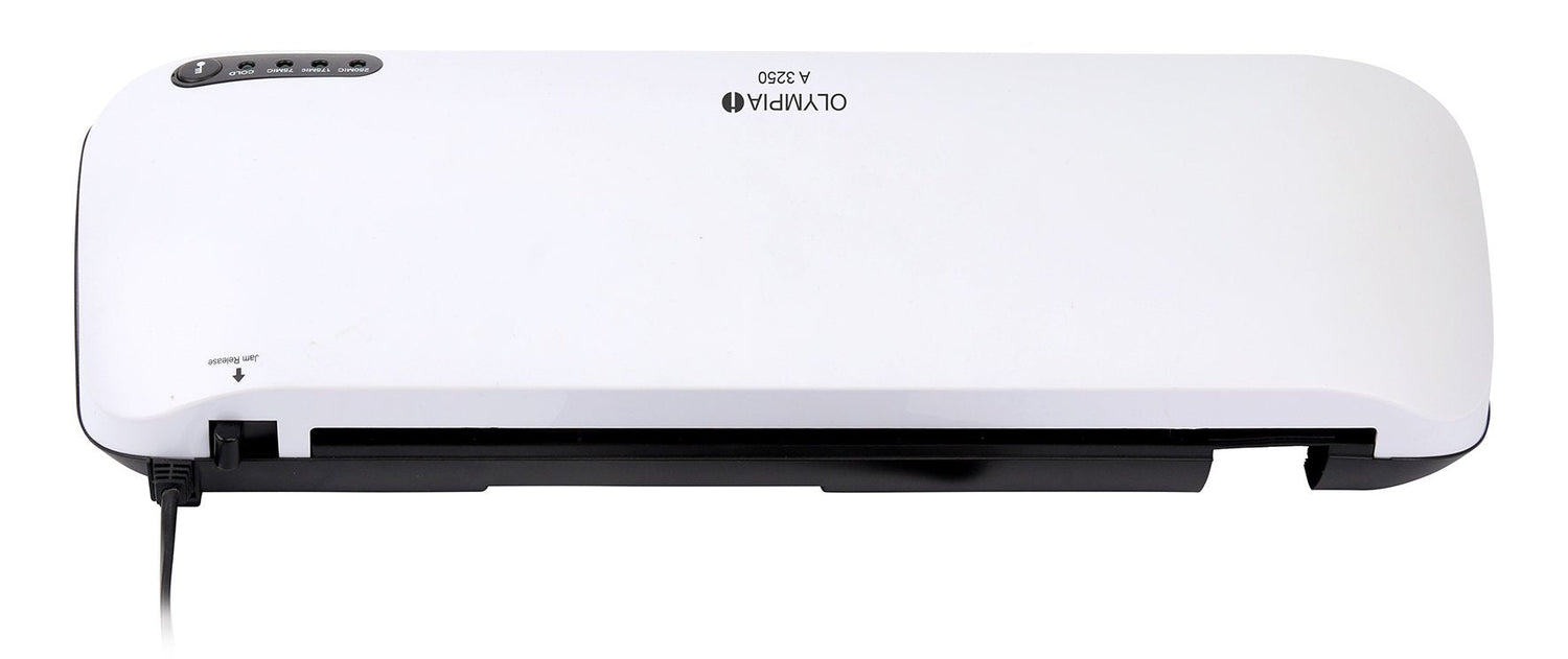 Olympia A 3250. Ancho máximo de laminación: 33 cm, Tiempo de pre calefacción: 6 min, Velocidad de laminación: 350 mm/min. Consumo energético: 480 W, Voltaje de entrada AC: 220-240 V, Frecuencia de entrada AC: 50 Hz. Ancho: 466 mm, Profundidad: 146 mm, Altura: 66 mm. Ancho del paquete: 510 mm, Profundidad del paquete: 162 mm, Altura del paquete: 82 mm