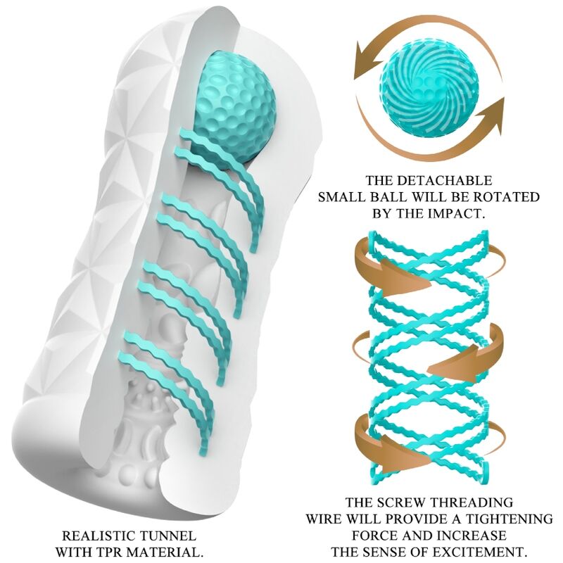 ¡Pequeña herramienta para una gigantesca diversión de masturbación! Este masturbador transparente y reutilizable tiene una espiral giratoria y una bola de estimulación en el costado, la espiral giratoria hace que el masturbador gire durante la penetración y la bola en la parte superior puede estimular el punto correcto y brindarle una nueva sensación. La funda presenta una textura estimulante y excitante en su interior que masajea el pene de forma intensa y dinámica durante un trabajo manual. Puede utilizar este elegante masturbador agradable para la piel una y otra vez. ¡Muy fácil de usar y puro placer!