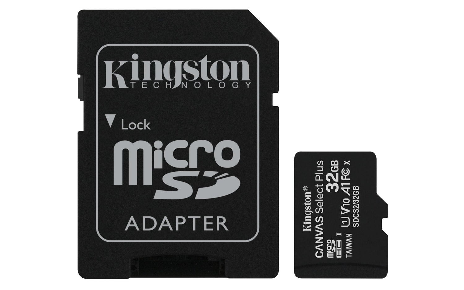 Kingston Technology Canvas Select Plus. Capacidad: 32 GB, Tipo de tarjeta flash: MicroSDHC, Clase de memoria flash: Clase 10, Tipo de memoria interna: UHS-I, Velocidad de lectura: 100 MB/s, Clase de velocidad UHS: Class 1 (U1), Clase de velocidad de vídeo: V10. Funciones de protección: Resistente a golpes, Resistente a las vibraciones, A prueba de rayos X, Color del producto: Negro