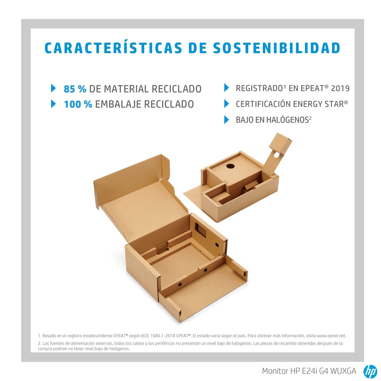 - La eficiencia energética se integra en todos los monitores con certificación ENERGY STAR y EPEAT 2020[3] y de bajo contenido en halógenos[4]. Vamos un paso más allá con un embalaje 100 % reciclable.