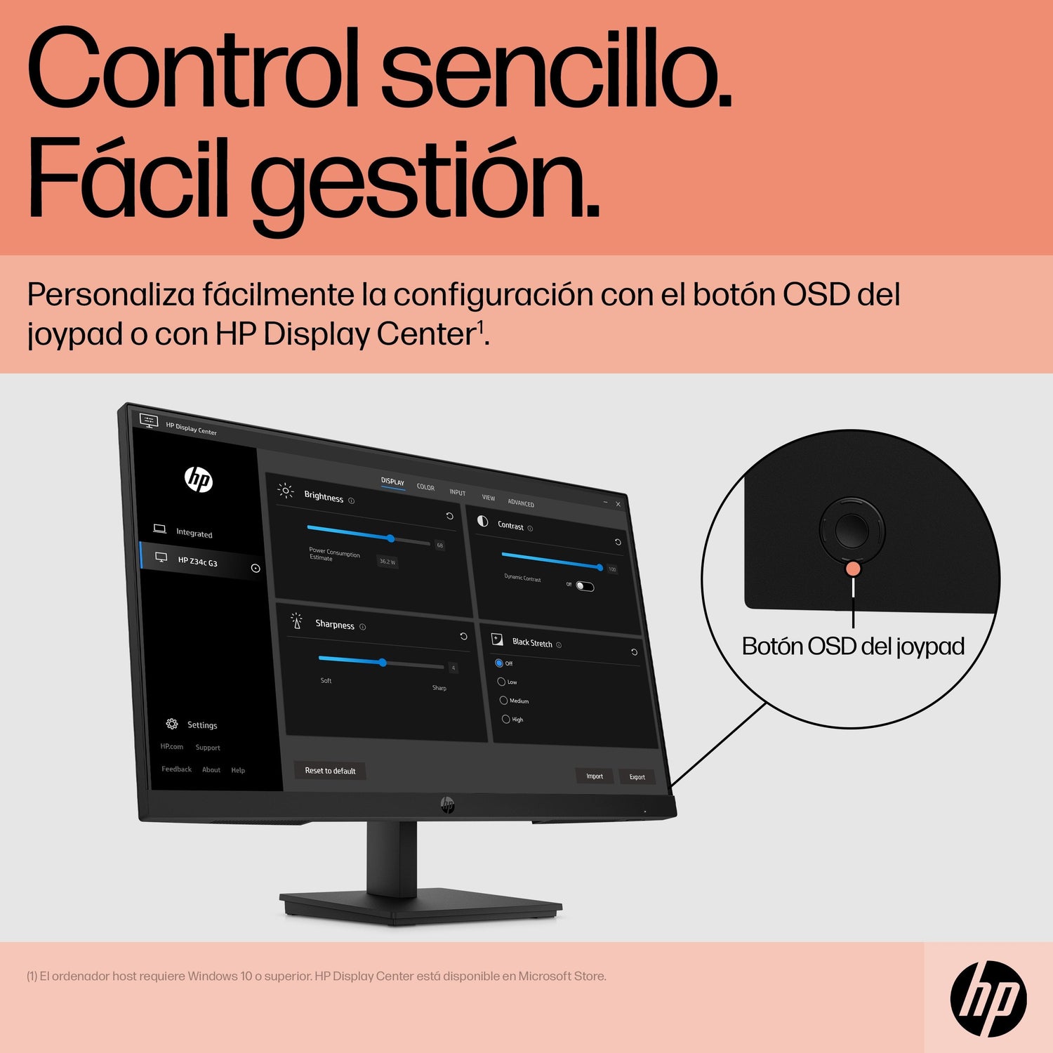 • Personaliza la configuración del monitor a través del botón intuitivo OSD del mando, o directamente en la pantalla con HP Display Center[2] y HP Display Manager[3] para, de este modo, simplificar tu espacio de trabajo.