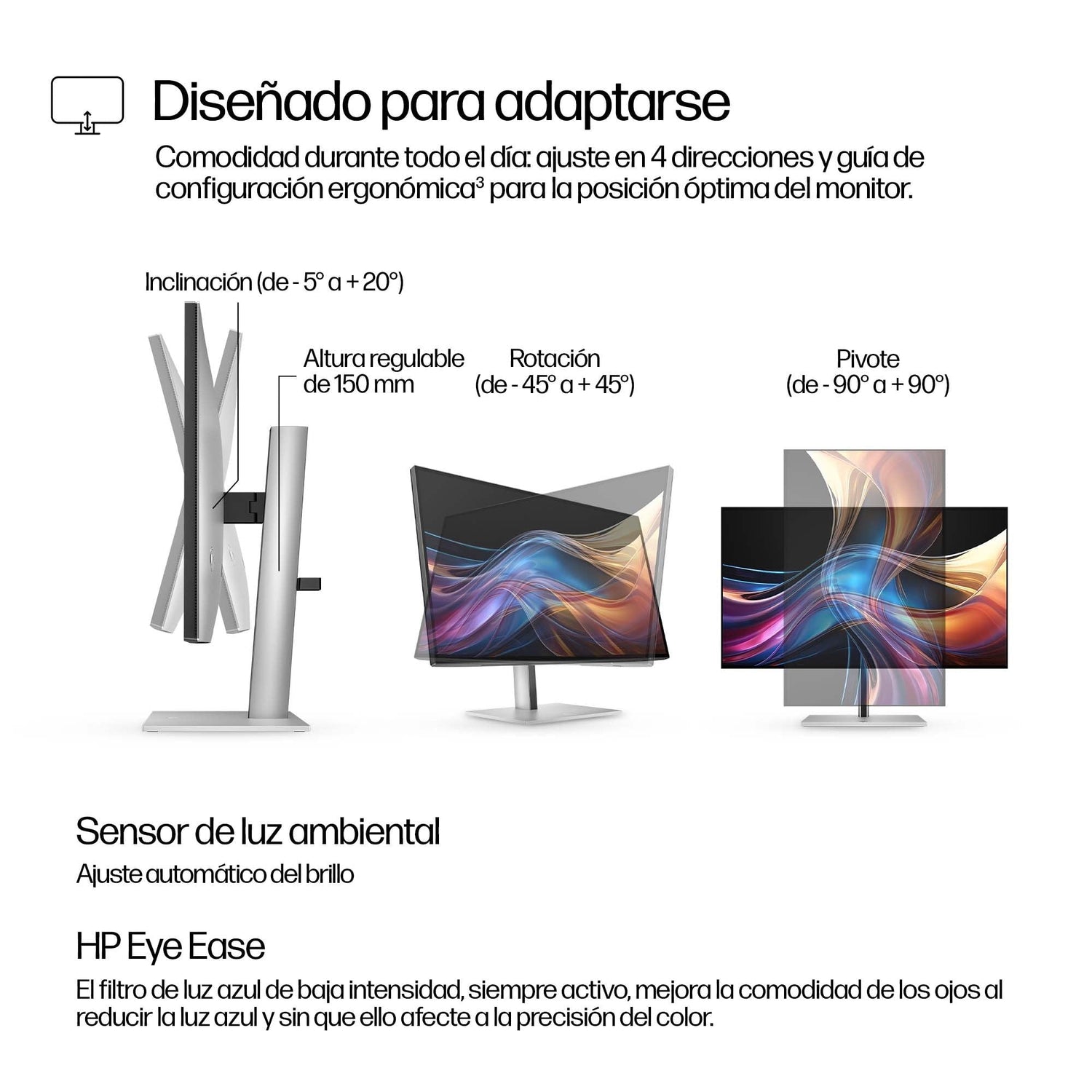 - Comodidad durante todo el día gracias a las 4 posiciones de ajuste y a la guía de configuración ergonómica[4] para la posición óptima del monitor. Asimismo, cuenta con el sensor de luz ambiental para ajustar de forma automática el brillo.