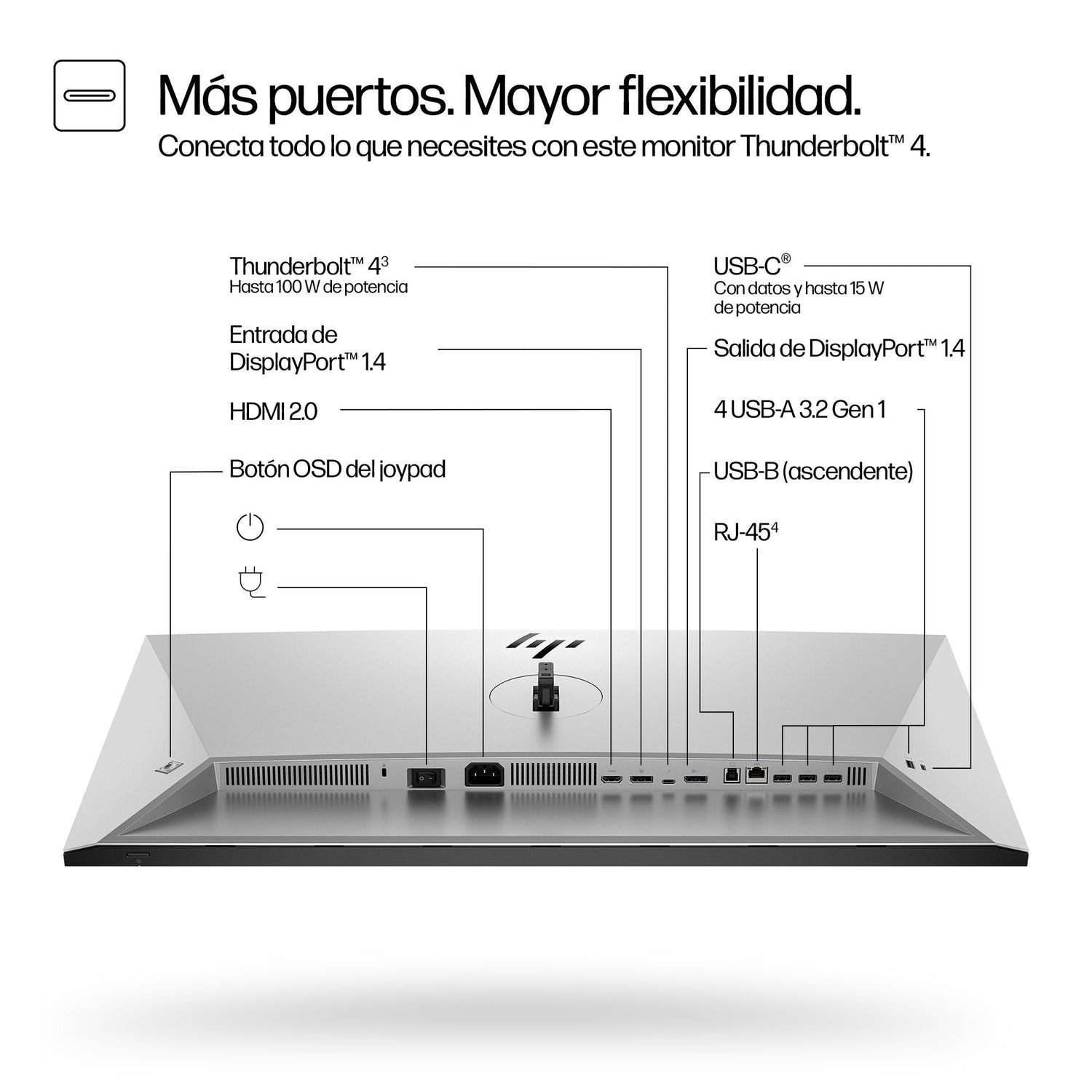 • Reduce el desorden y maximiza la productividad gracias a la conectividad Thunderbolt™ 4 que ofrece vídeo, datos a 40 Gbps y alimentación a través de un único cable.[2] Conecta todos tus accesorios y carga tu portátil con hasta 100 W, todo ello gracias al hub del monitor.