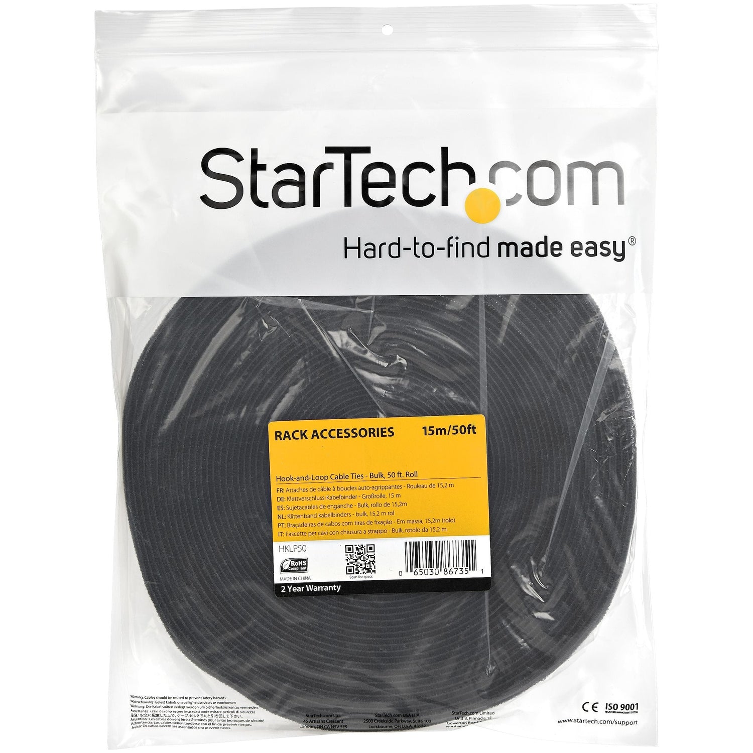 StarTech.com Bobina de 15,2m de Gancho y Bucle - Tiras Reutilizables de Gancho y Bucle - Cinta Sujetacables - Envolturas Ajustables de Tela para Gestión de Cableado - Negro. Tipo: Bridas adherentes para cables, Material: Nylon, Color del producto: Negro. Longitud: 15200 mm, Ancho: 19 mm, Grosor: 2,4 mm. Cantidad por paquete: 1 pieza(s). País de origen: China, Ancho de la caja principal: 475 mm, Longitud de la caja: 482 mm
