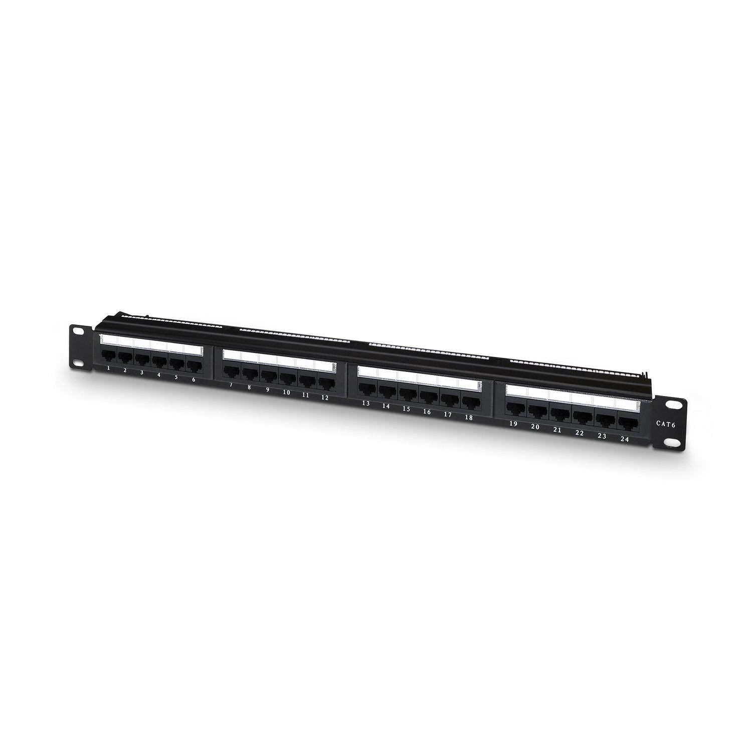 Panel de parcheo de 24 puertos con gestión de cables para conexión RJ45 cat.6 utp.