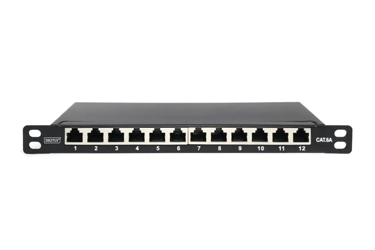 Digitus CAT 6A Slim Patch Panel, blindado, 12 puertos, 0,5 U, 10", negro. Estándares de red: IEEE 802.3af, IEEE 802.3at, Tecnología de cableado: 10Base-T, Tipos de cable soportados: Cat6a. Color del producto: Negro, Material: Acero, Montaje: Montaje en bastidor. Ancho del paquete: 60 mm, Profundidad del paquete: 260 mm, Peso del paquete: 890 g. País de origen: China