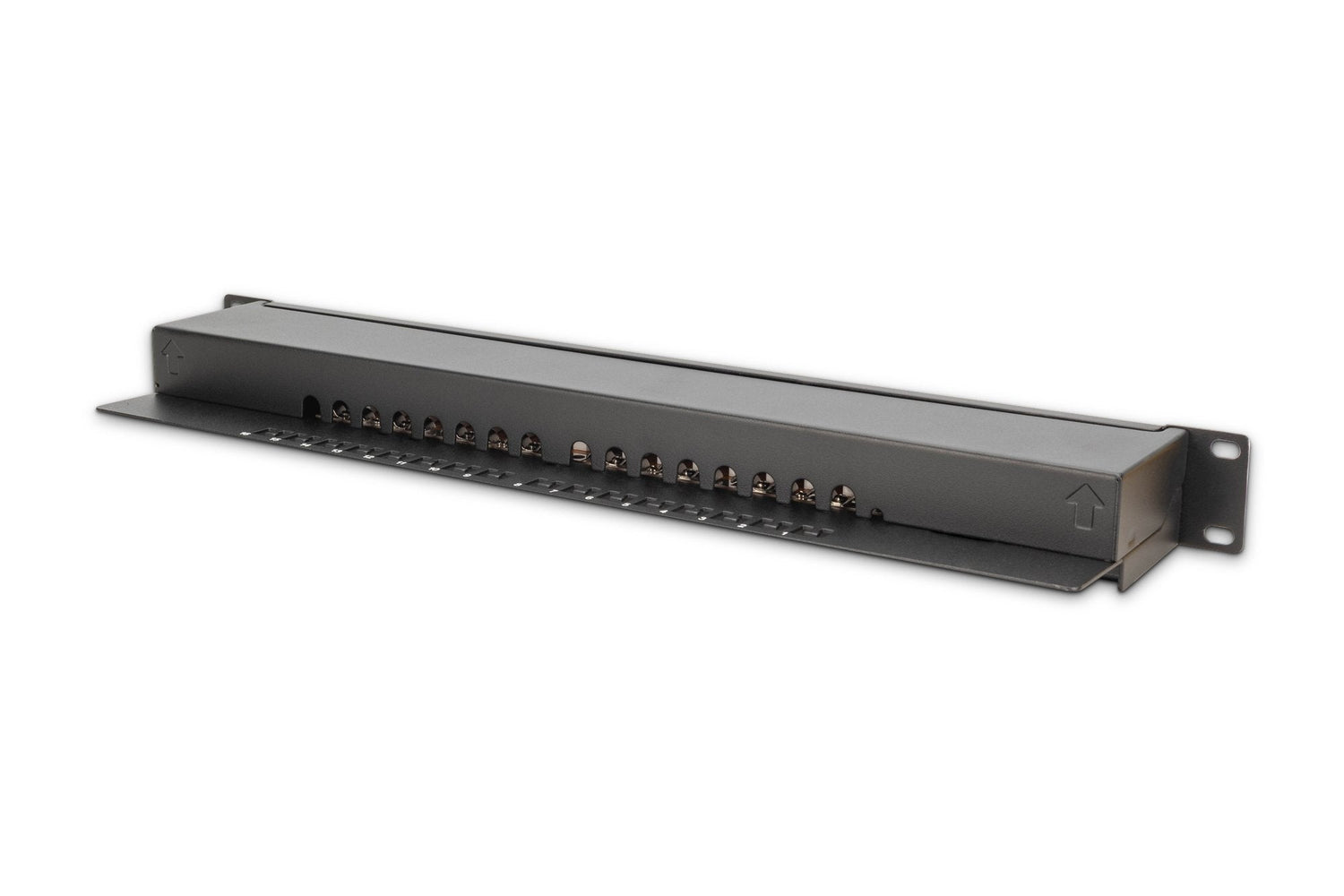 El panel de conexión CAT 6 apantallado de DIGITUS® está disponible en la versión de 16 o de 24 puertos. Está fabricado de conformidad con los requisitos del Enlace de Rendimiento de clase E, para un máximo de 250 MHz, ISO/IEC 11801 y EN 50173 y cumple con el estándar 802.3at PoE+ y 802.3af PoE. La carcasa está hecha de acero laminado de 1,5 mm galvanizado en frío y por ello es perfecta para montaje en armarios de 19".