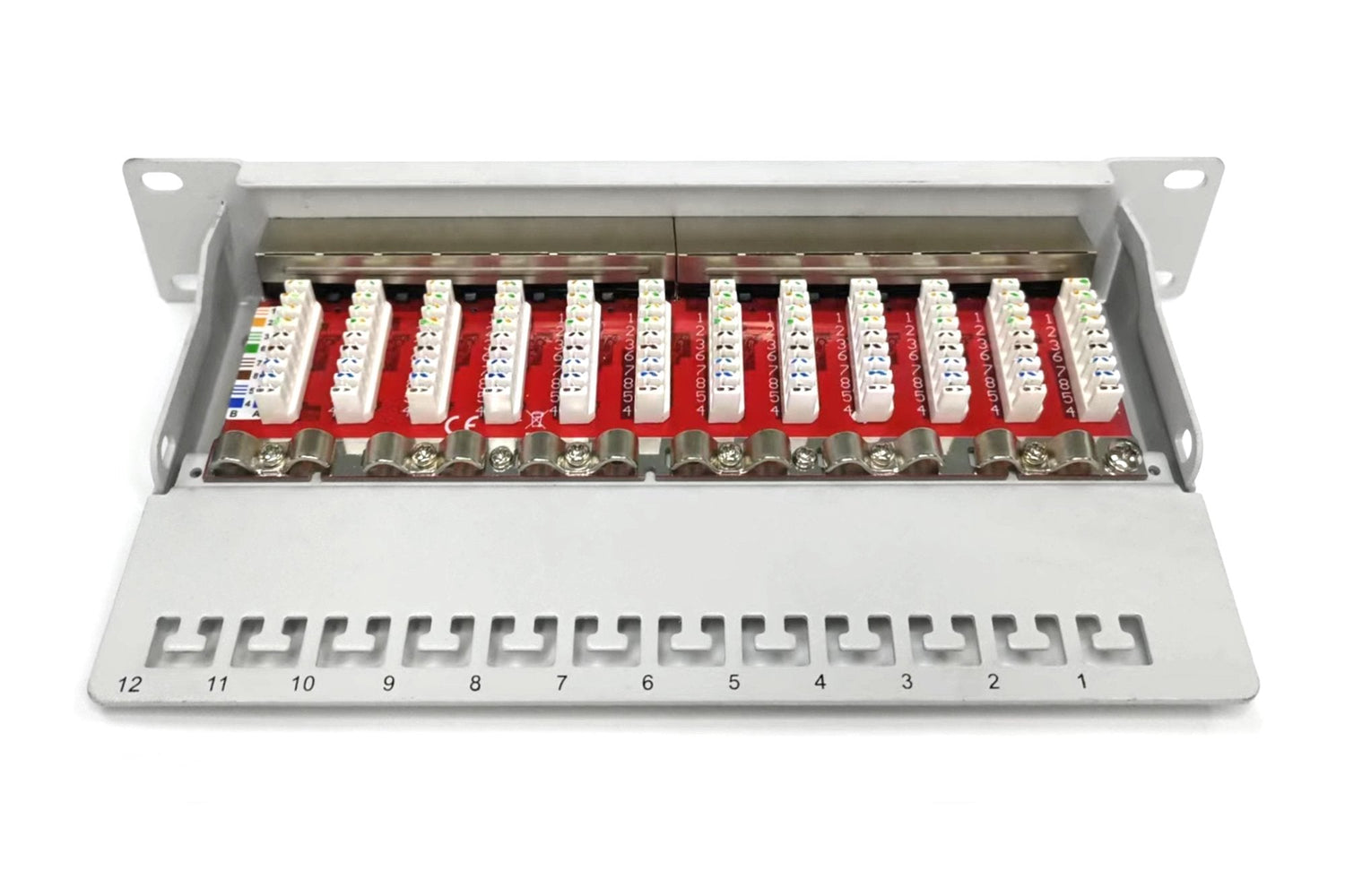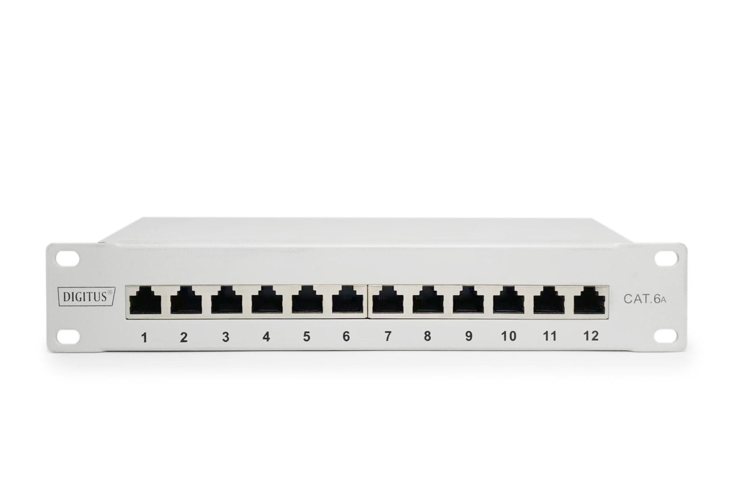 Digitus Panel de conexión CAT 6A, apantallado, 12 puertos 1UA, 10", gris. Tipo de interfaz ethernet: 10 Gigabit Ethernet, Conector: RJ-45, Tipos de cable soportados: Cat6a. Color del producto: Gris, Material: Metal, Montaje: Montaje en bastidor. Ancho del paquete: 60 mm, Profundidad del paquete: 260 mm, Peso del paquete: 890 g. País de origen: China
