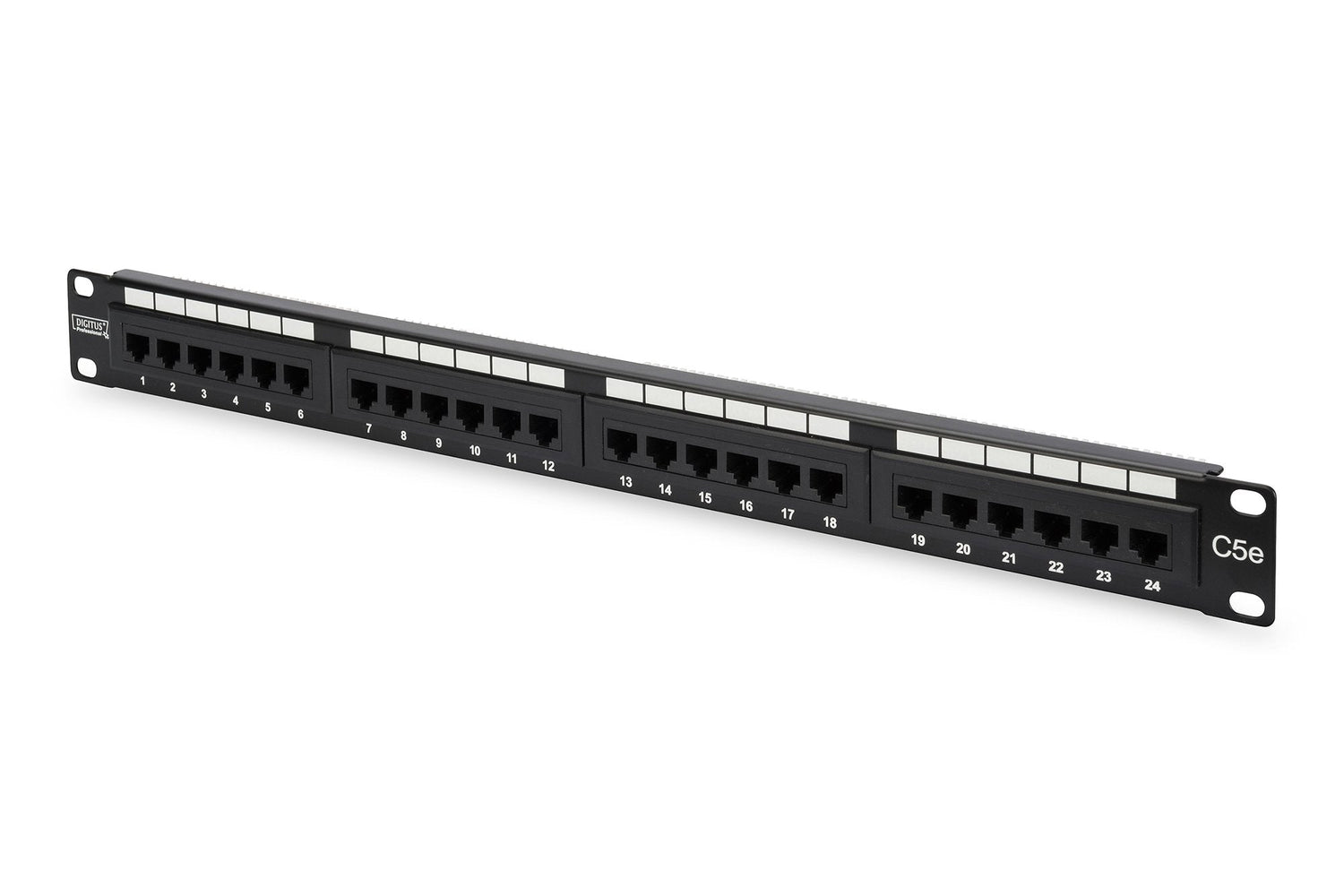 El panel de conexión CAT 5e sin apantallar de DIGITUS® está disponible con 16 o 24 puertos (1 unidad rack) o 48 puertos (2 unidades rack). La carcasa está hecha de acero laminado galvanizado en frío de 1,5 mm y por lo tanto es perfectamente adecuado para montaje en rack de 19".